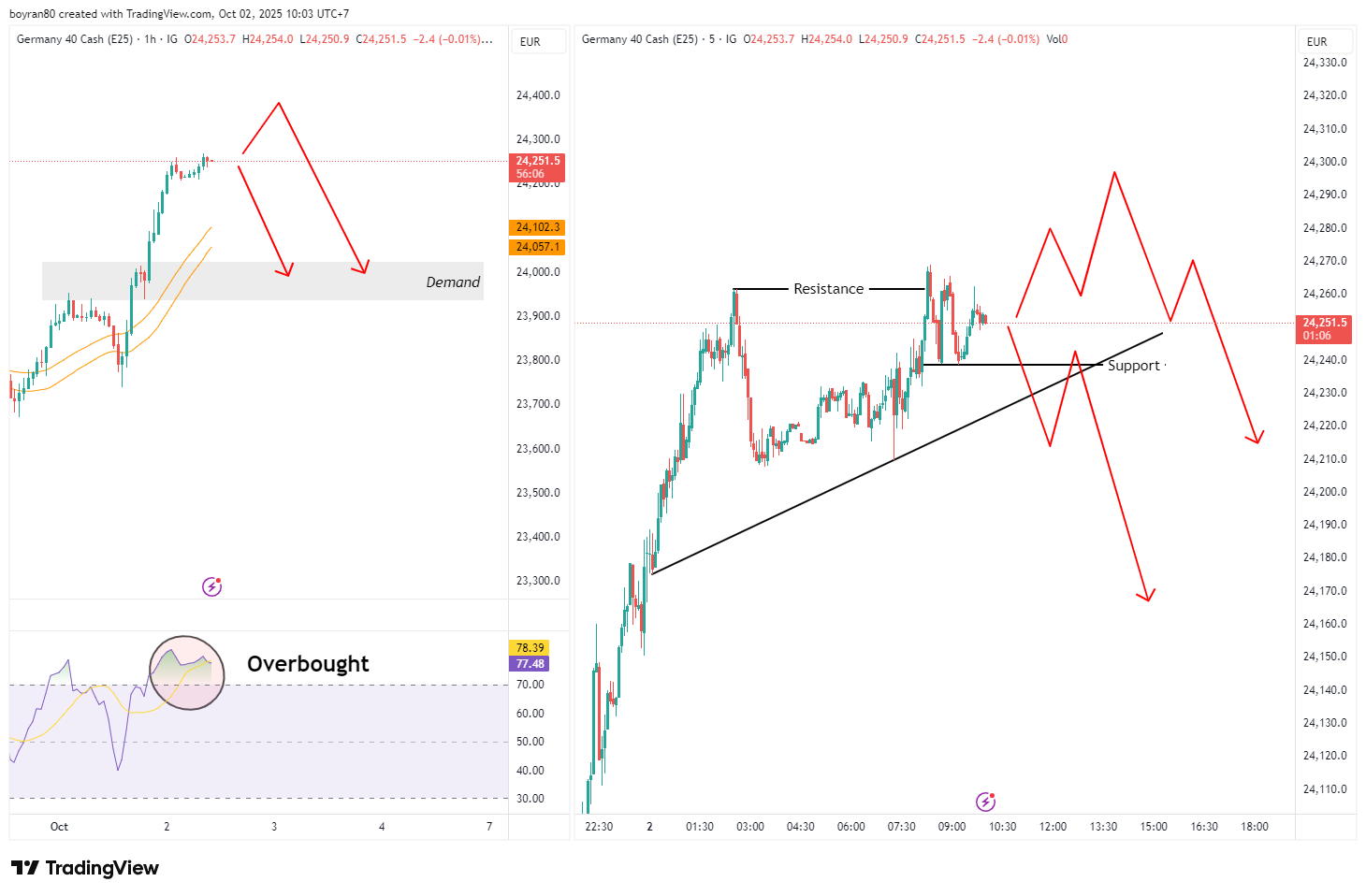 Pergerakan DAX (Germany 40) saat ini menunjukkan kenaikan yang sangat signifikan, dengan harga melambung hingga mencapai area 24.250. Namun, kondisi teknikal terbaru mengindikasikan bahwa indeks Jerman ini sedang berada di zona overbought, yang sering kali menjadi tanda awal potensi pembalikan arah.