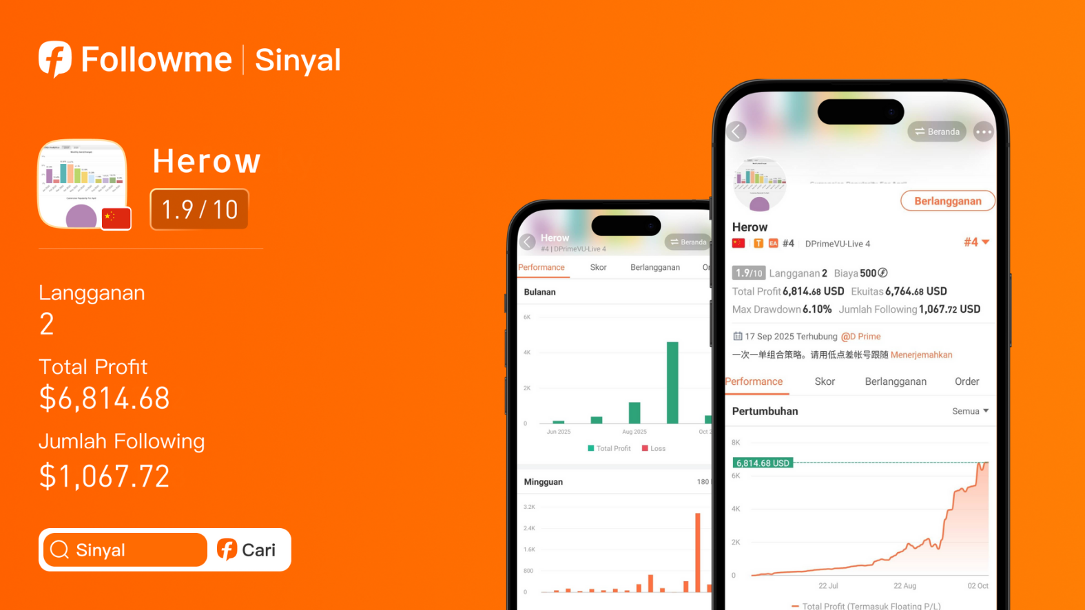 Nickname: Herow China Broker: DPrimeVU XAU/USD Specialist Herow, trader spesialis emas (XAU/USD), berhasil mencatatkan performa impresif. Bermodalkan hanya $350, ia mampu mengembangkan akunnya hingga profit kumulatif $6,814.68 dengan total return fantastis mencapai 1947%. Dengan win rate 62.23%