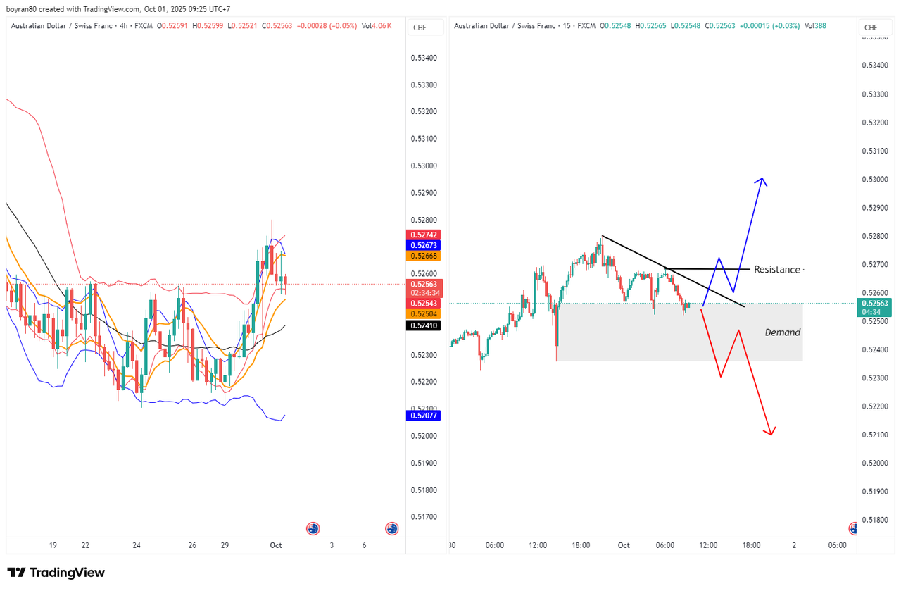 Pergerakan AUD/CHF saat ini sedang mengalami retracement setelah kenaikan pada 29 September 2025. Harga kini berada di sekitar WMA 5/10 Low, yang dalam metode BBMA OA sering menjadi area ideal bagi buyer untuk masuk kembali. Pada timeframe lebih kecil (M15), area ini juga bertepatan dengan zona dema