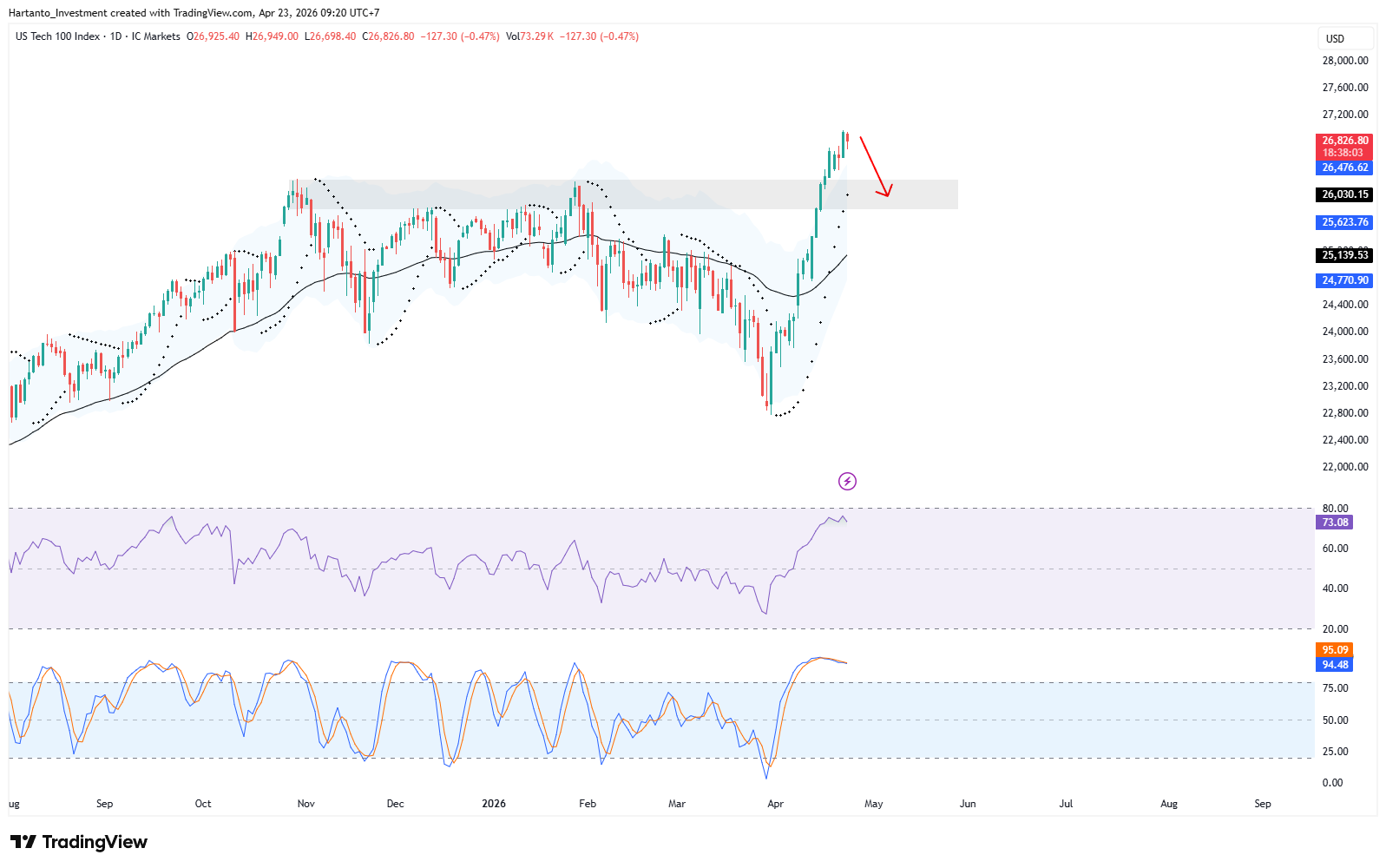US Tech 100 pada timeframe Daily saat ini menunjukkan kondisi overbought, terlihat dari indikator RSI yang berada di atas level 70 serta Stochastic yang sudah berada di area jenuh beli dan mulai melandai. Kondisi ini mengindikasikan momentum bullish mulai melemah setelah rally kuat sebelumnya, sehin