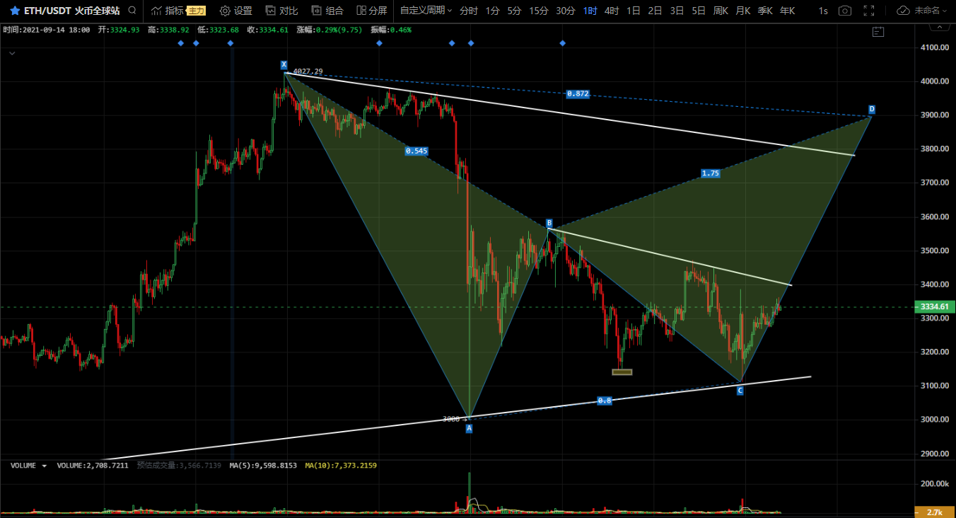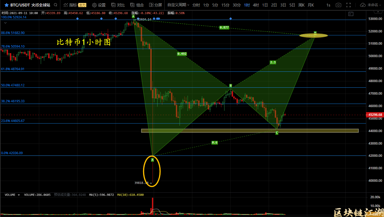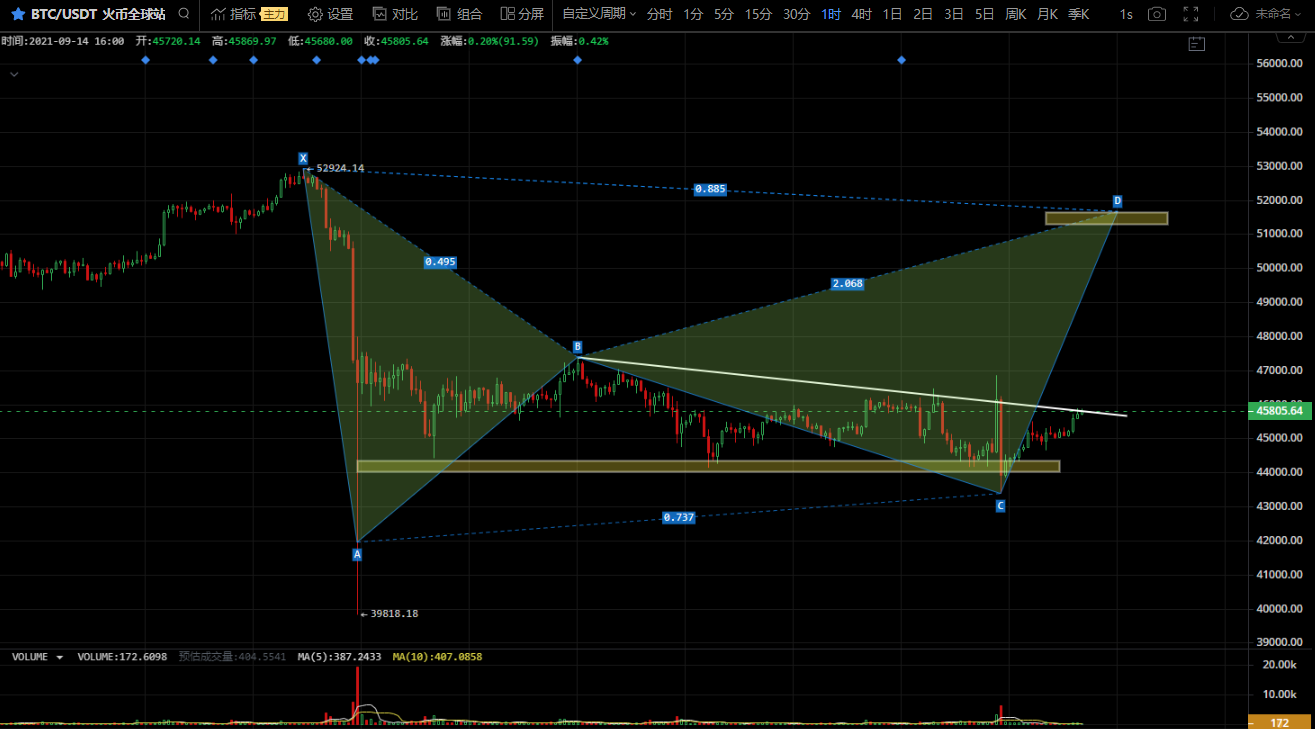 夏风,越来越远;秋意,越来越浓。秋高气爽,遍地红枫,枝头桂花,别是一番姹紫嫣红。秋分,爽朗,像似久别重逢的恋人,经过了漫长的煎熬,思念把对方疯长在脑海,按捺不住的汹涌澎湃。秋风清,秋露冷,秋月光满,桂花飘香。将秋日的时光对折,一半许给繁华,一半留给静谧。落日萧萧,菊花欲开,即凄凉,又清爽!最后,夏天成了故事,秋天成了风景,秋亦从容,我亦从容。 比特币价格在反弹中测试44000美元的压力并有站稳的意向,可见这波下跌之中的抄底资金还算给力,但大的风险还未改变,依旧是老徐昨天说的日线级别蝙蝠形态。但从小级别走势来看,比特币价格走势在构建鲨鱼后市看跌形态,目前比特币走势正在完成CD反弹阶段,而反弹的目