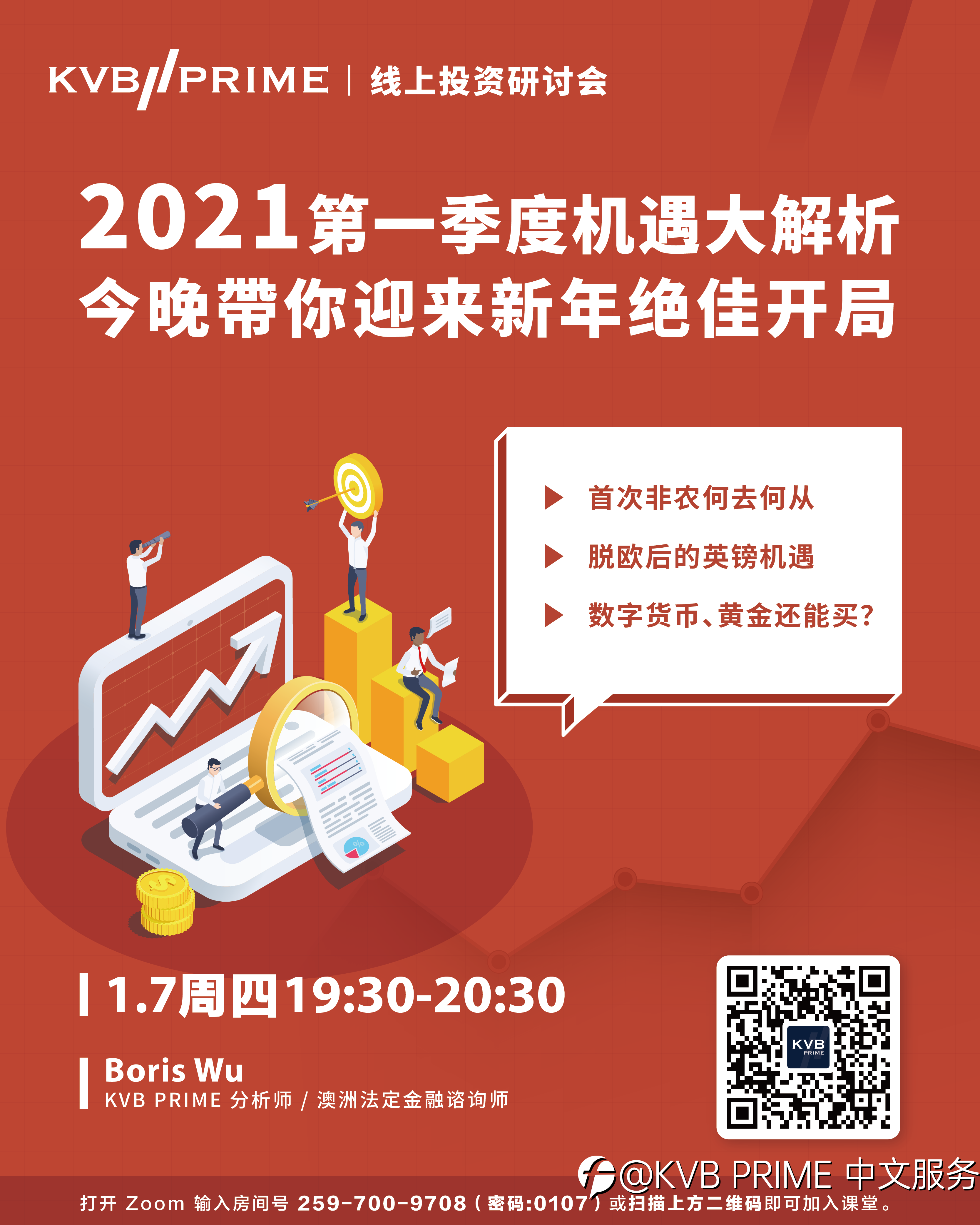 全球领先的交易商 KVB PRIME 将于1月7日晚上19:30举办线上投资研讨会,并邀请KVB PRIME 特约分析师Boris Wu作为主讲人, Boris Wu为澳大利亚知名机构——维度国际的创办人,拥有独立量化团队,并具备13年金融衍生品交易经验,其提供的交易报告多次被《第一财经》等权威媒体引用,多次受邀担任名校新南威尔士大学担任金融咨询客座讲师,帮助数以千计的投资者获得更好的交易表现。 Boris将为本次线上讲座带来以下三个主题: 1) 首次非农何去何从 2) 脱欧后的英镑机遇 3) 数字货币,黄金还能买? 本周五即将迎来2021年首个非农就业数据,此数