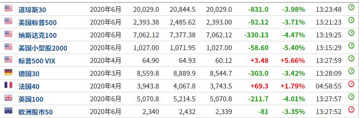 周三午后,美股三大股指期货触及止损跌停限制。欧股期货跌势也加大,英国富时100指数跌4.7%,德国DAX指数跌4.2%。
