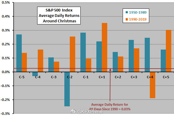 作者:GKFXPrime,原创所有,转载请联系 美股圣诞行情期间被利空和利好消息接连攻击,昨日美股期货市场迎来大波动。VIX指标一度上涨至31.5,创出11月以来的最高水平。欧洲股市更是受伤最深,昨日收盘DAX30指数下跌2.82%,英国富时100指数跌1.73%,法国CAC40指数跌2.43%.预想中的欧美股市圣诞节甜蜜时刻尚未到来,但是变异病毒却突袭金融市场,一时间令人躲闪不及 (理想VS现实) 什么是圣诞节行情? 圣诞节行情指的是圣诞节当周以及元旦之后的开盘日,欧美股市通常出现上涨的状况。1950年至2018年的70年间,临近圣诞姐时,标普500指数日回报率上升,最高可达0.3%。完整来