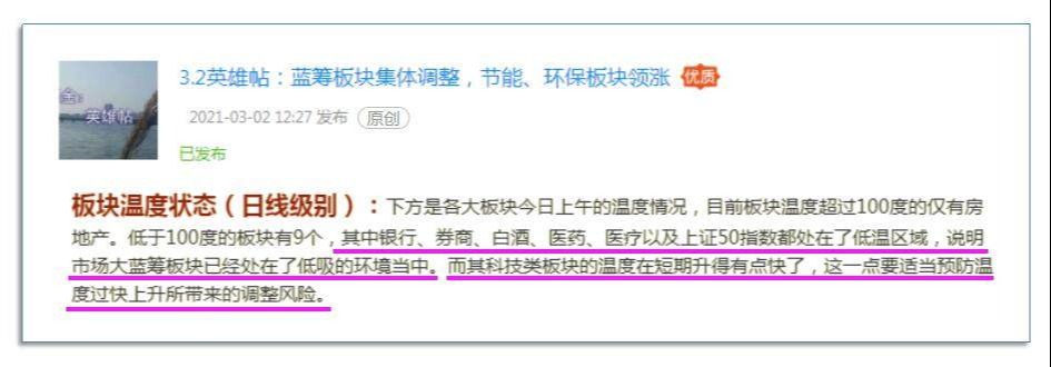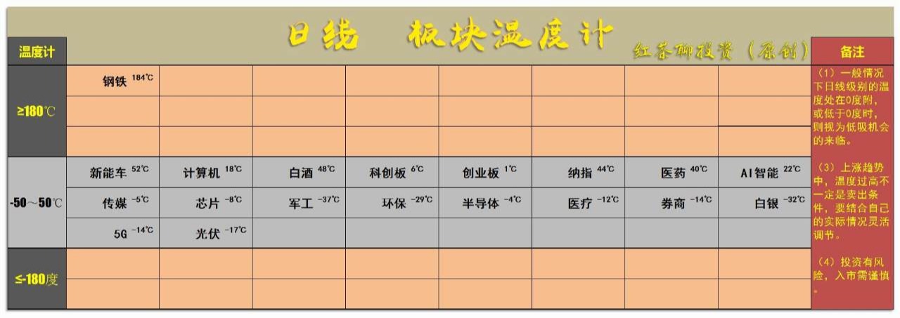 今日上午,A股市场低开低走,然而北上资金却继续大幅度流入,此时又巧遇蓝筹指数与大盘指数同步回踩到支撑附近,短线反弹随时都将展开…… 【日线级别温度】 下方是各大板块今日上午收盘前的温度情况,其中温度超过180度的板块只有1个了(昨天还有10个的),温度低于180度的板块数量为0,温度处在0度附近的板块有17个板块。从这一现象可以看出,超高温度的板块在降温的同时,超低温度的板块也在想办法升温,他们都在向0度区域(即-50度到50度)的这个区域集中,说明市场板块间的轮动效果明显哦~这一点大家可以对照昨天《英雄帖》中的温度表一起来看。 【上午股市概要】 今日早盘沪深两市双双低开,之后就一路震荡下跌,