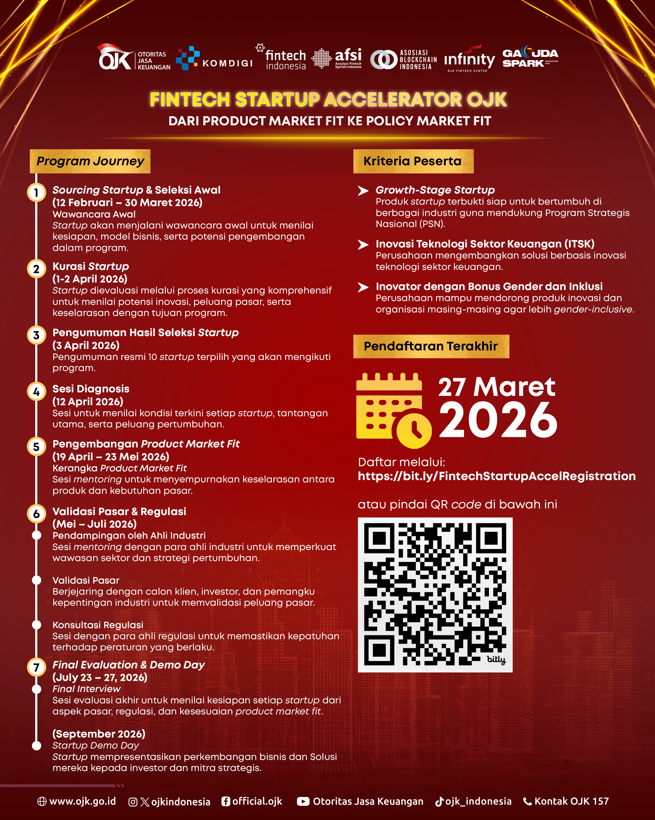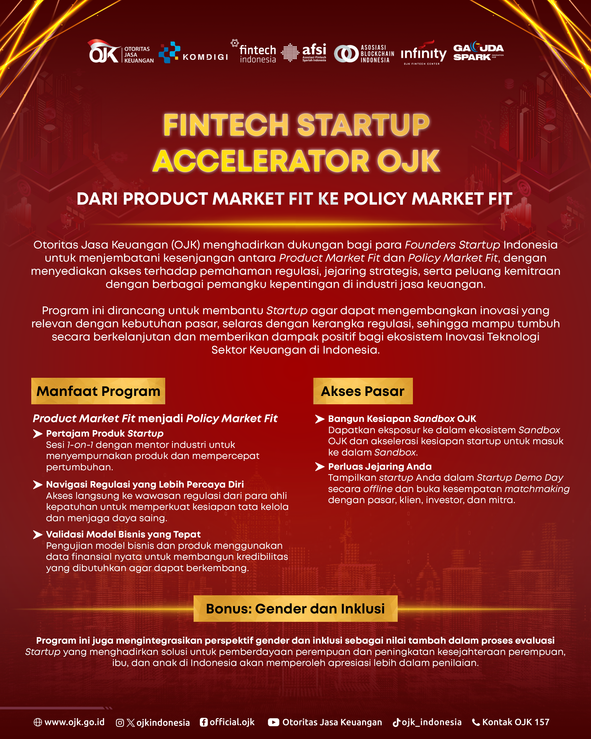 Otoritas Jasa Keuangan (OJK) menghadirkan dukungan bagi para Founders Startup Indonesia untuk menjembatani kesenjangan antara Product Market Fit dan Policy Market Fit, dengan menyediakan akses terhadap pemahaman regulasi, jejaring strategis, serta peluang kemitraan dengan berbagai pemangku kepentin