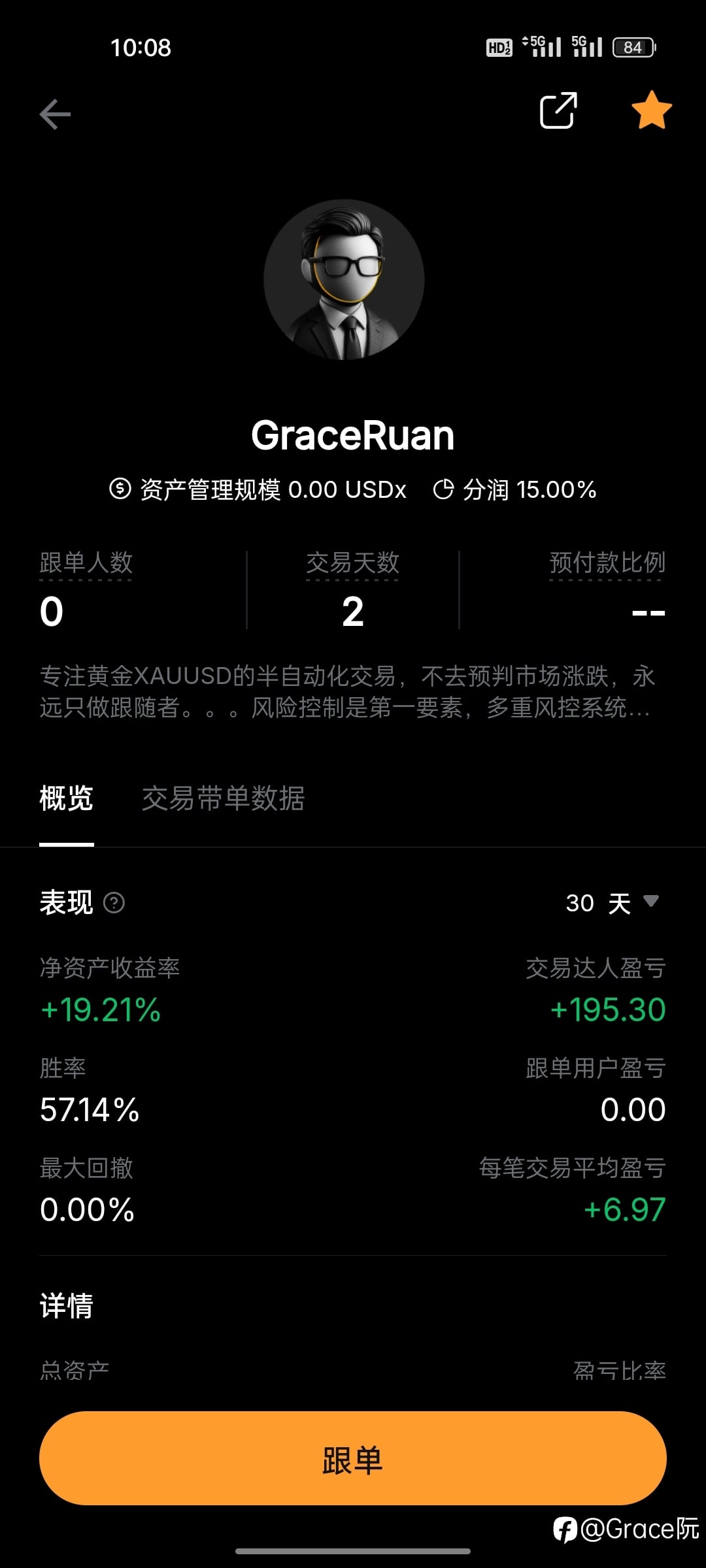 这个账号非常强,是 FollowMe 社区“一看就会被点进来”的那种类型。+242% 实盘曲线,短线高胜率也能做到低回撤 @目标:摧毁基金 交易账户概览 200|TradeMaxGlobal-Live2(MT4)* 项目 指标数据 净值 $4,001.32 账户余额 $4,052.22 总收益 $3,052.22 收益率 +242.13% 🚀 胜率 77.73% ⭐⭐⭐⭐ 最大回撤 11.44%(非常优秀) 交易笔数 292 单 平均盈利 $24.90 平均亏损 -$40.02 平均持仓时间 1.3 小时 最低跟单资金 $1,000 交易风格与