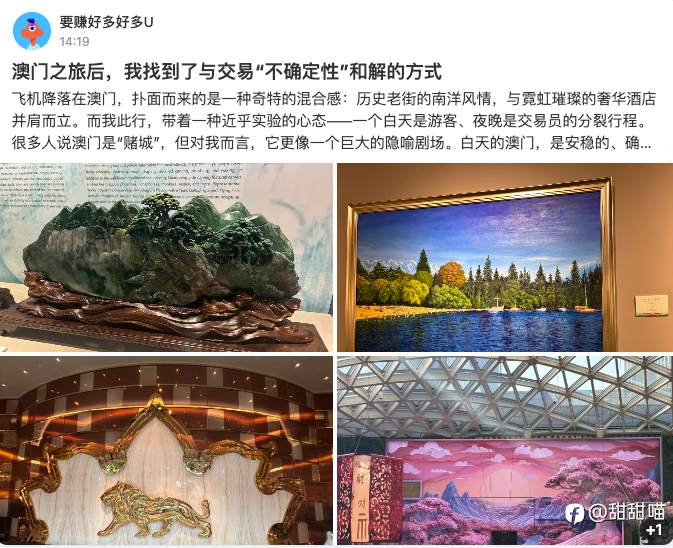 1.@要赚好多好多U 哇,你这趟澳门之行太有深度啦!在澳门两种截然不同氛围的交织下,你竟然悟出了和交易 “不确定性” 和解的妙法,把交易归位,不被其完全左右生活,这种转变超赞👍 就像你说的,心中能同时安放交易的变幻和生活的安稳,这才是真正的修行呀~ 2.@俊富资管理财 想吃想吃想吃想吃想吃想吃想吃想吃想吃想吃想吃想吃 3.@冷子秋 喵喵的德州在江浙沪学会的 4.@鹰眼视界 说不定这一去,你就成为那个被幸运之神眷顾的人啦 5.@海量财经