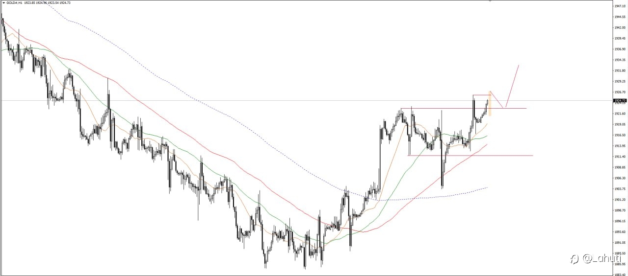 #Gold khung ngắn hạn H1 (trong ngày) Gold hôm qua không giảm về được điểm chờ mua ở $1910 ($1911) và hiện tại giá đang có dấu hiệu phá vỡ khỏi biên độ dao động. Kế hoạch chờ mua ngay lúc này chỉ có một là khi giá tiếp tục mở rộng đà tăng với giá đóng cửa vượt khỏi đường kháng cự (mức giá cao