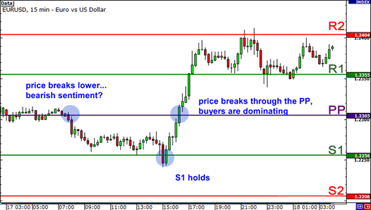 Có một cách khác để kết hợp các điểm xoay Pivot vào chiến lược giao dịch ngoại hối của bạn và đó là sử dụng nó để đánh giá tâm lý thị trường. Điều này có nghĩa là bạn có thể biết liệu các nhà giao dịch có xu hướng mua hay bán cặp tiền tệ hơn hay không. Tất cả những gì bạn cần làm là theo dõi điểm xo