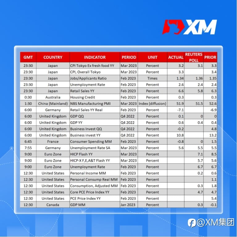 随着科技股引领的反弹步伐加快,股市本周及本季度将以乐观情绪收尾美联储发言人维持加息选项,美元坚挺,但第一季度仍下跌东京CPI无法阻止日元下跌,随后关注美国和欧元区通胀数据 动荡季度结束,银行业混乱不影响股市 本月初突如其来的银行业危机对股市造成沉重打击,但股市反弹速度同样令人惊讶,目前即将以强劲的增长结束本季度。 科技股引领大部分反弹,尤其是华尔街的大型科技股。自硅谷银行(SVB)引发抛售以来,由于苹果(Apple)和微软(Microsoft)等热门股票的防御吸引力重新发挥作用,纳斯达克综合指数和纳斯达克100指数之间出现显著差异。 相比之下,由于担心流动性紧缩,规模较小的科技竞争对手一直苦苦