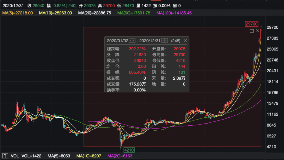 在2020年的最后一天,币圈再度沸腾! 比特币今日盘中再创历史新高,这场资本的盛宴仍在继续。 12月31日,比特币突破29000美元关口,若按照今日盘中高点29700计算,10年前1元购买的比特币,目前已经赚1180多万元。如果投资1000元,则狂赚118亿! 今年以来比特币疯狂上涨,今年以来累计涨幅超300%,不仅历史首次站上20000美元关口,而且涨势不断,未来或向30000美元进发。 比特币市值接近贵州茅台+五粮液 12月31日,比特币再度刷新历史新高,首度突破29000美元/枚,24小时上涨逾2000美元。 虽然随后稍有回落,但是在震荡区间中仍得到支撑。从日线级别来看,迎来了两连阳,接