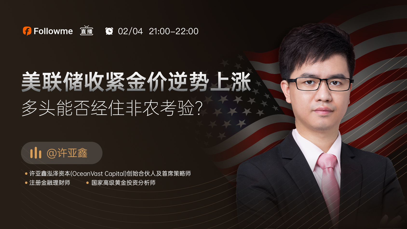 自上周起,乌克兰事件不断升级引发金价巨幅震荡。在短短几个交易日内就发生了约100美元的波动。尽管国际紧张局势给全球经济前景蒙上了一层不确定性,但多位美联储官员仍暗示下月大概率将加息。美国1月新增非农就业近50万,且薪资大幅度上升。美联储1月会议纪要也就此表示,美国通胀率过高,在目前非农数据向好的情况下有理由尽快进行一次加息。这很有可能结束黄金市场的震荡,暂时关闭金价的上升通道。 俄乌冲突不断升级,FOLLOWME 诚邀 @匠鑫学院 院长许亚鑫老师 来到直播间,聊聊本次非农究竟能否开启黄金的下降通道,为大家挖掘美指多空机会,明晰美元通胀趋势。本周五晚21:00,在 FOLLOWME 直播间,许亚