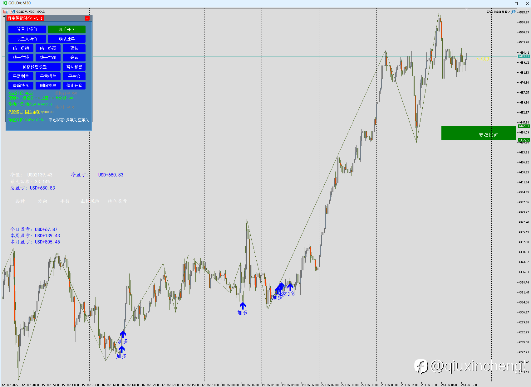 原创 XAU USD掘金计划 XAU USD掘金计划 2025年10月22日 18:35 河南 听全文 一、趋势与周期分析 1小时图 - H1(1小时)周期:前期上升趋势破位后进入下跌趋势,当前处于“下跌后的反弹阶段”,整体空头趋势未被逆转。 15分钟图 - M15(15分钟)周期:反弹至红色“阻力区间”后明显承压回落,短期空头力量占优。 二、关键支撑与阻力 - 阻力区间:图表中红色区域(M15和H1周期共振阻力),是短期反弹的强压制位。 - 支撑区域:下方关注 4040 - 4050 区间(H1周期前期低位附近,具备潜在承接力)。 三、具体交易策略 (一)做空策略