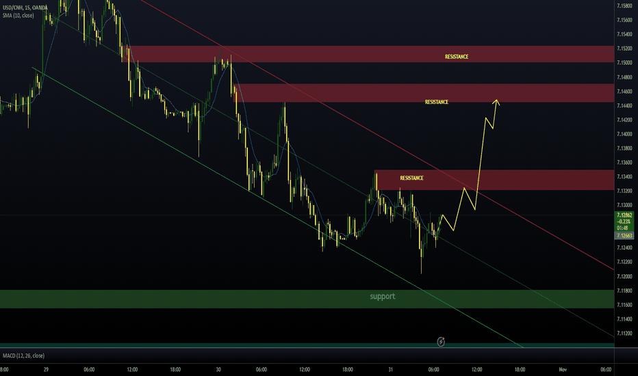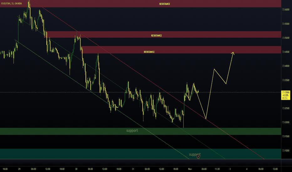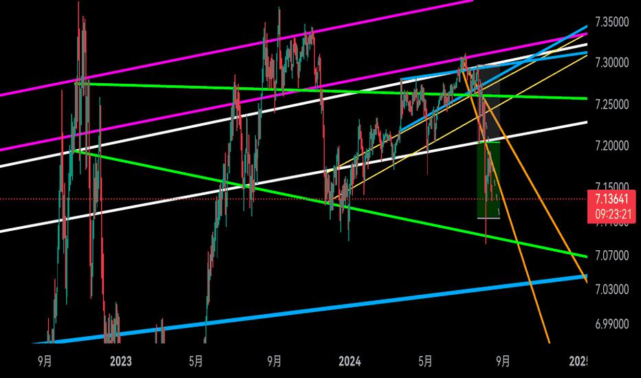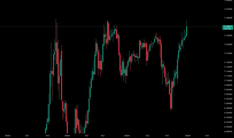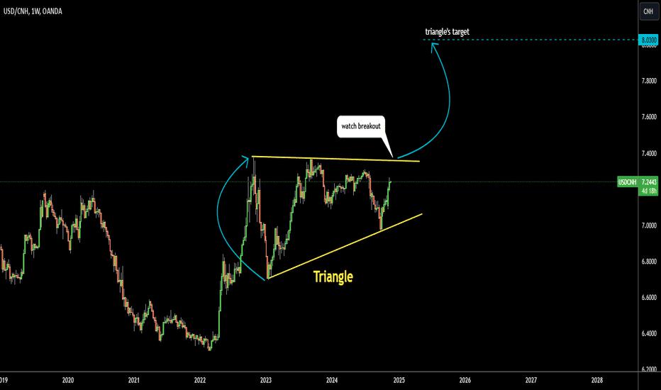 #USD/CNH# Consolidation on the weekly chart has shaped the well-known Triangular pattern (yellow). Watch the breakout of the upside barrier around 7.3650 for confirmation. The target is located at the height of the widest part of Triangle added to the upside of the pattern. It's 8.03 C