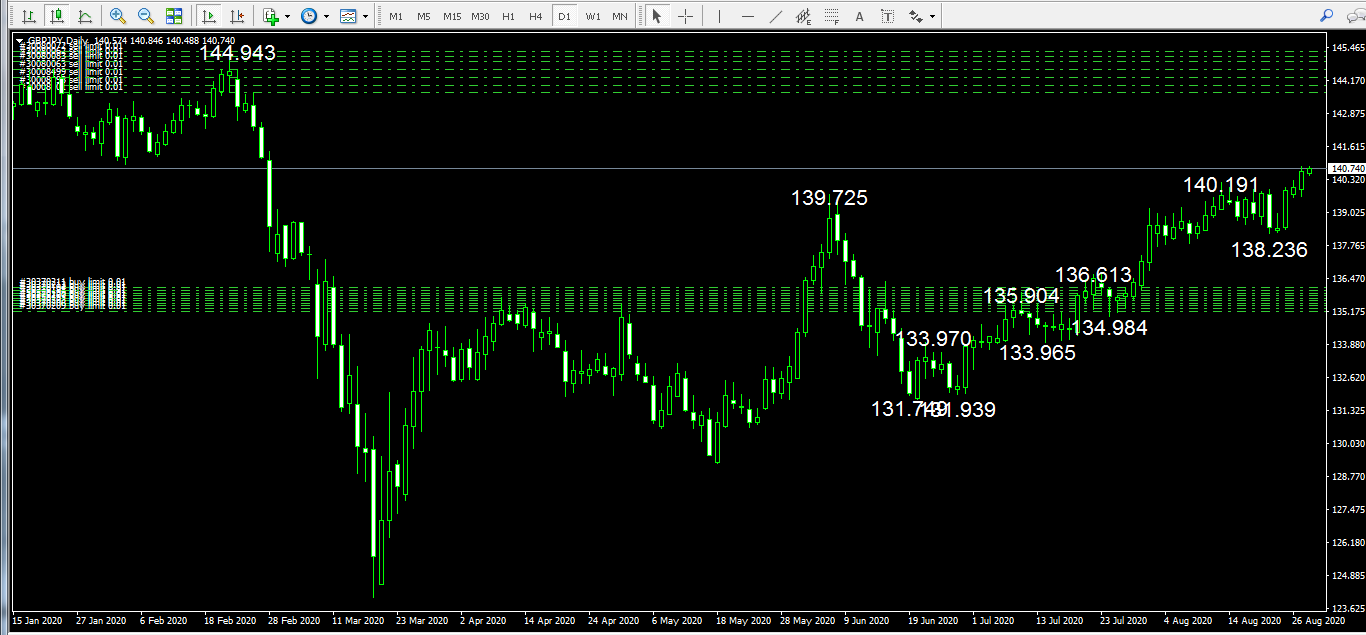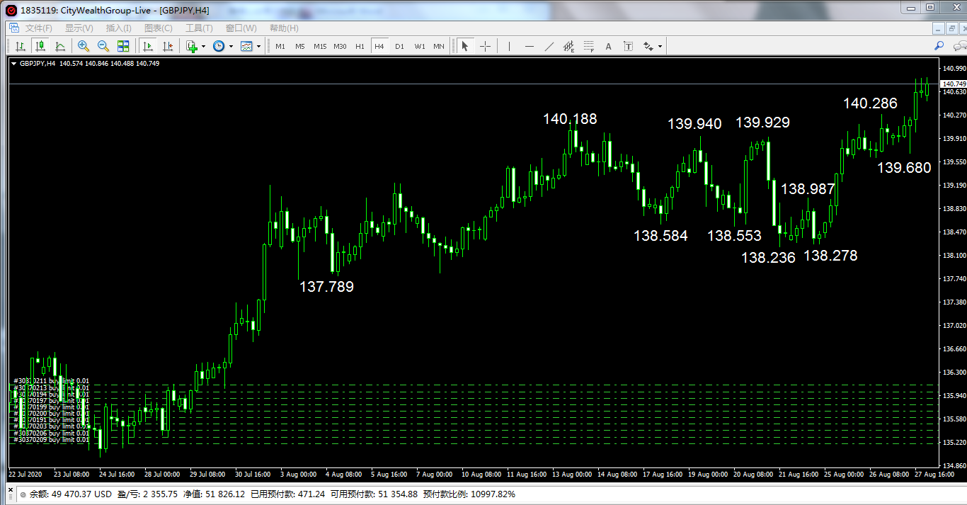 风险控制是投资交易的核心,净值的最大回撤最好控制在10%以内,年化收益风险比在200%以上,无杠杠市场仓位在20%—90%变换,高杠杠市场以1倍杠杠作为底仓2—5倍杠杠作为浮仓,盈亏比控制在1.5以上。严控风险后收益超过其他利率就可以充分利用其他资金入市,扩大本金追求复利成长,睡后收入在等你。上周五提到英镑兑日元在本周很可能出现4连阳的冲天炮,果不其然从周一开盘涨到周五。价格已经脱离140.19—138.236的震荡,从138.236向上运行着自从131.749以来的第5大浪主升浪拉升。131.749—135.904为浪1运行14个交易日上涨4100点,133.965—140.191运行22个