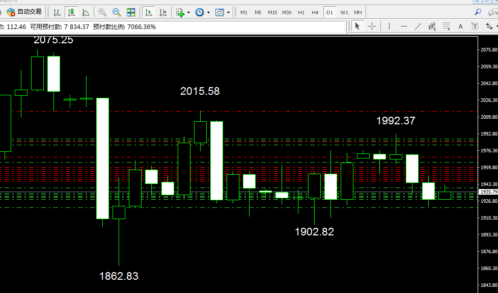 风险控制是投资交易的核心,净值的最大回撤最好控制在10%以内,年化收益风险比在200%以上,无杠杠市场仓位在20%—90%变换,高杠杠市场以1倍杠杠作为底仓2—5倍杠杠作为浮仓,盈亏比控制在1.5以上。严控风险后收益超过其他利率就可以充分利用其他资金入市,扩大本金追求复利成长,睡后收入在等你。经过3个交易日的连续下跌,下坡形K线组合已经形成,尤其是美盘连续向下特征明显,最少等同于2015.58—1902.82的下跌趋势级别出现,甚至等同于2075.25—1862.83的下跌规模在9月份也不能排除。日线周期下,2075.25—2015.58—1992.37波段高点下移,1862.83—1902.