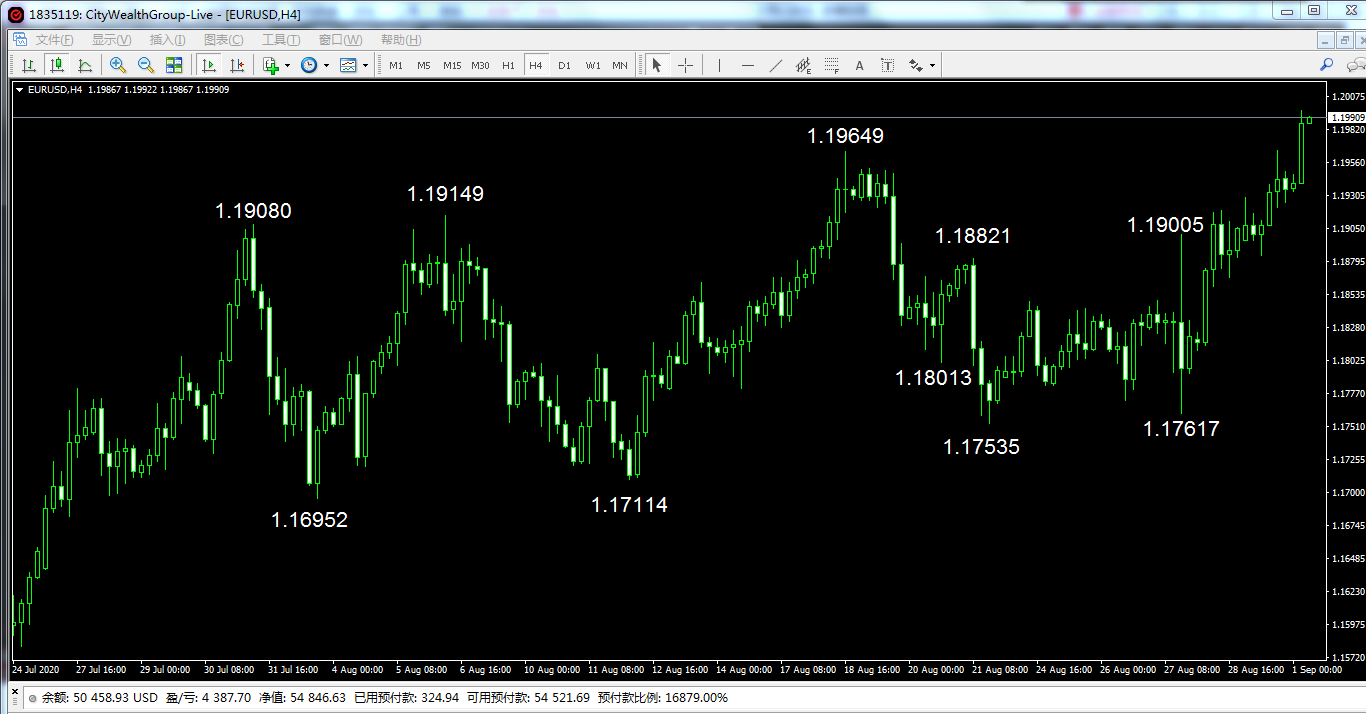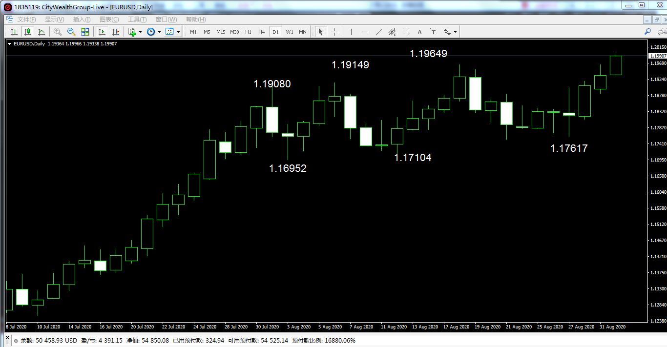 风险控制是投资交易的核心,净值的最大回撤最好控制在10%以内,年化收益风险比在200%以上,无杠杠市场仓位在20%—90%变换,高杠杠市场以1倍杠杠作为底仓2—5倍杠杠作为浮仓,盈亏比控制在1.5以上。严控风险后收益超过其他利率就可以充分利用其他资金入市,扩大本金追求复利成长,睡后收入在等你。自从上周四见低点1.17617以来,欧元兑美元再度日线连阳构成单边一笔,这就使得三笔折迭取代顶底分型交替,即1.17104—1.19649—1.17617—现价,在结构方面,淘汰了1.19080—1.16952—1.19149—1.17104。上涨有上坡形,下跌有下坡形,下坡形见底,上坡形出来后回撤,也就