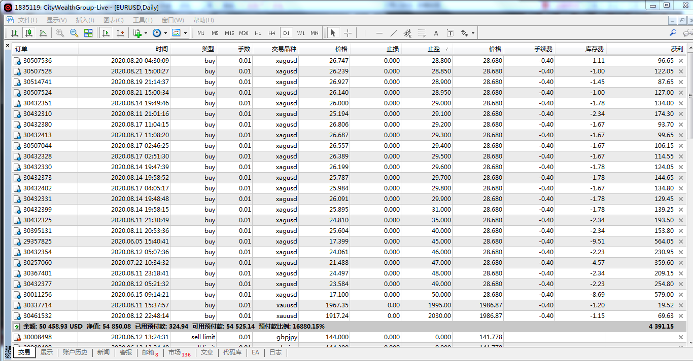 风险控制是投资交易的核心,净值的最大回撤最好控制在10%以内,年化收益风险比在200%以上,无杠杠市场仓位在20%—90%变换,高杠杠市场以1倍杠杠作为底仓2—5倍杠杠作为浮仓,盈亏比控制在1.5以上。严控风险后收益超过其他利率就可以充分利用其他资金入市,扩大本金追求复利成长,睡后收入在等你。8月13日以来,白银收盘价线错落有秩的向右起伏延伸,收盘价中的最高与最低不足1.8美元,山峰27.446—27.441—27.418密集在27.4,山谷26.142—26.677—26.495平均在26.4,主力资金控盘明显。26.4—27.4的横向趋势持续了十多个交易日,打破这种震荡格局将在9月初。4小