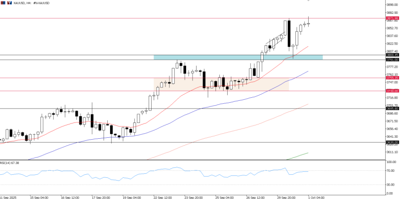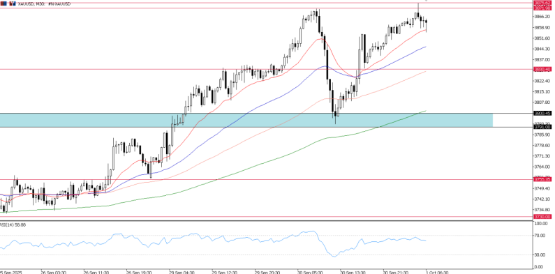 市场紧绷:美国政府停摆期限临近, 黄金延续涨势 美国政府关门风险成为焦点 由于参议院未能通过临时拨款法案,美国政府正濒临部分关门,最后期限定在午夜。如果无法达成协议,联邦机构正准备应急方案,数万名雇员可能被迫休假。 部分运作(如海关与边境保护局的关税征收)预计将继续进行,但更大的风险在于关键经济数据(包括本周五的非农就业报告)可能被推迟,这将使美联储的政策评估更加复杂。 历史经验显示,政府关门往往对长期经济影响有限,但短期内常会引发市场情绪与流动性波动,打压美元与美股,同时推升黄金和美债等避险资产。 黄金:先跌后涨,再创纪录 周一,黄金继续刷新纪录高位,收于 3,858.84 美元/盎司。盘中
