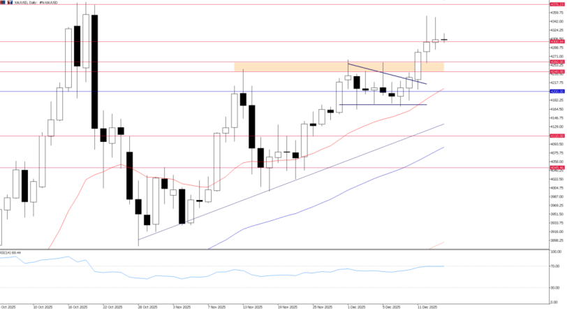 鹰派点阵图,鸽派基调——美元承压,黄金蓄势待突破 美联储决议:鹰派点阵图,鸽派基调 美联储昨夜按市场预期下调利率25个基点,将目标区间降至3.50%–3.75%。然而,市场反应更多受到声明中的鸽派基调影响,而非点阵图的鹰派信号。 · “鹰派”点阵图:尽管美联储下调利率以支持劳动力市场,更新后的经济预测摘要(SEP)显示2026年的宽松节奏将放缓。中位数点阵图显示,明年的降息次数低于市场预期,因通胀风险仍然存在。 · 投票分歧:9票支持降息,2票维持不变,1票支持50个基点降息; · 市场结论:这体现了典型的“鹰派降息”,市场对2026年激进宽松的押注被移除。 尽管点阵图和投票分歧(2票维持不变