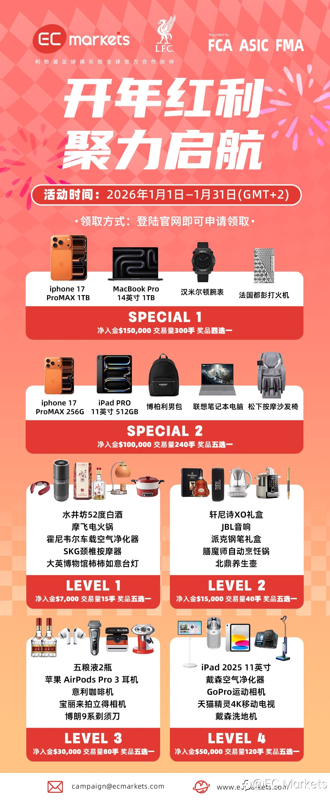 岁序更替,华章日新。值此 2026 年新岁启幕之际,EC Markets 客户专属交易达标有礼活动,邀您共赴交易新程,解锁多重惊喜礼遇。 活动时间:2026 年 1 月 1 日至 1 月 31 日 活动期间,凡参与交易的客户,只需达成相应标准,即可兑换丰厚好礼。我们始终秉持专业、合规的服务理念,为全球交易者提供稳定、透明的交易环境,此次活动更是以实实在在的福利,回馈每一位伙伴的同行与信赖。 交易之路,道阻且长,却也满载机遇。EC Markets 凭借前沿的技术支持、专业的行情分析以及贴心的客户服务,助力交易者洞察市场趋势,把握盈