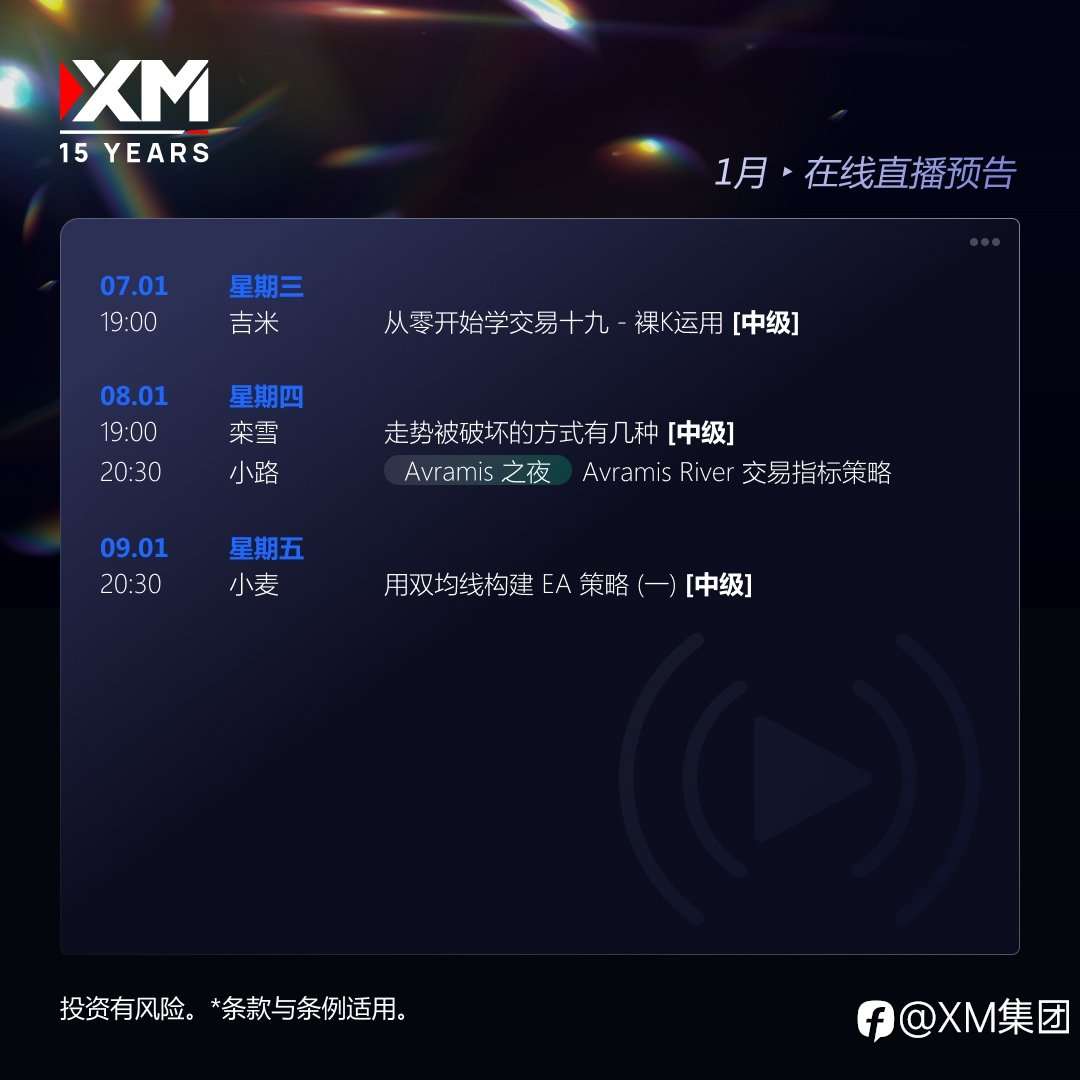 📢 2026开局,市场新机遇来了!稳准把握趋势,抓住关键机会,为新一年交易打下坚实基础! 🔥 XM中文直播课堂 —— 每周一到周五,1+小时实战课程,从底层逻辑到实盘操作,帮你建立正确、高效、可落地的交易思维,让交易能力真正升级! 🌟 本周重点推荐 —— 双均线EA策略(一),从均线理论讲起 → 深入底层逻辑 → EA执行指令演示,带你循序渐进掌握高效自动化交易模式。 🎯 锁定XM直播课堂,趋势判断、实战操作全覆盖,全方位强化你的交易能力! 🎯 XM本周直播课程亮点 从零开始学交易十九 - 裸K运用【中级】 :深入理解裸K核心逻辑,从价格波动、形