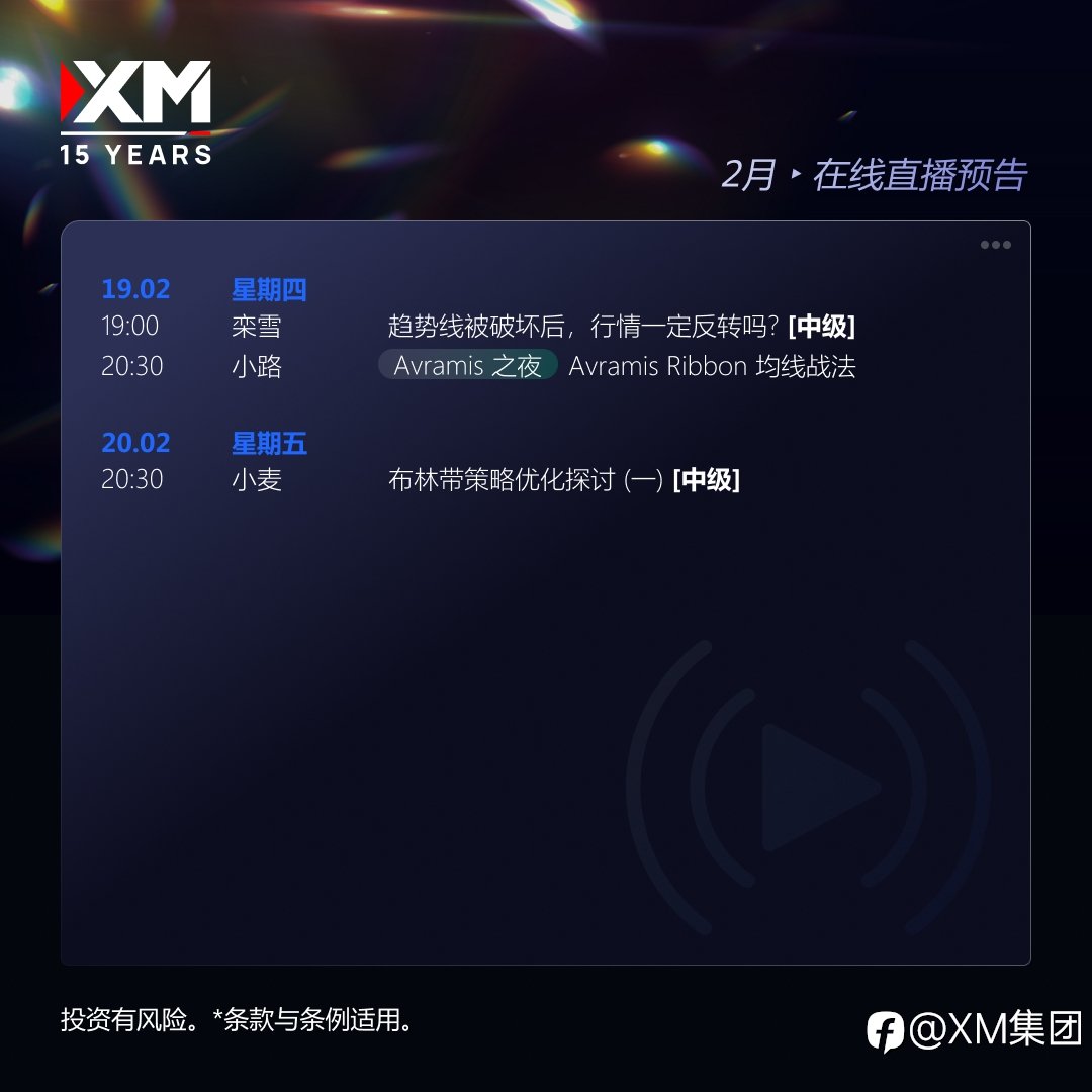 📢 还在纠结该进场还是观望?行情波动剧烈,真正拉开差距的,是进出场节奏与执行力。 每周一至周五,1+小时实战内容, XM中文直播课堂带你洞察市场节奏,系统掌握交易策略与关键出场技巧,持续提升交易稳定度与胜率! 🌟 下周重点推荐 — 布林带策略优化探讨(一)【中级】 深入解析布林带的实战应用与优化逻辑,让你在震荡与趋势行情中,都能灵活应对、稳健出手。 锁定直播,从行情判断到实盘执行,全面强化你的交易决策能力! 🎯 XM下周直播课程亮点 · 趋势线被破坏后,行情一定反转吗?【中级】:趋势线并非绝对防线,结合多周期关系,判断行情是延续还是反转。 ·