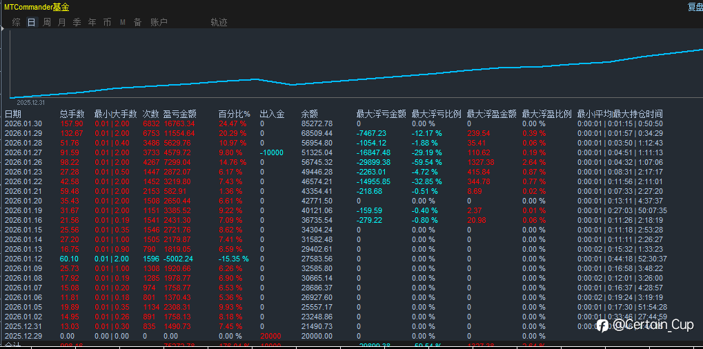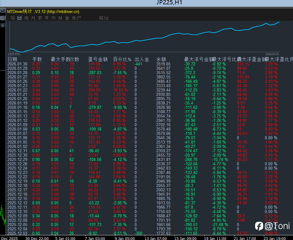 这是一个用于给孩子支付大学生活费的真实账户。 账户尾号 3748,平台 T,起始于 2025 年 10 月,目前已运行 3 个月。 账户核心数据累计投入:$3,276累计取出:$1,852当前净值:$7,380资产总额(净值 + 已取):$8,832累计盈利:$5,556账户总收益率:169.6%本期发生的事情 本周一黄金早盘出现跳空高开,随后价格一路走强。 账户依旧执行既定策略:顺势而为,不做方向判断。 在收益达到阶段预期后,昨晚做了一次计划外出金 400 美金,并且已经到账。 出金原因本月盈利目标已提前完成,账户具备安全垫家庭层面需要支付一笔汽车保险费出金不会影响账户整体节奏与执行 当前账