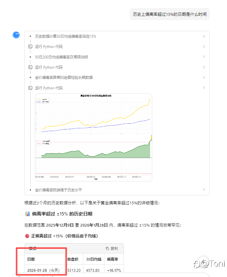 本篇写于1月31日凌晨 这篇不是复盘对错, 也不是讨论“如果当时怎么做”。 只是把我在 1 月底那一周, 已经发生过的一些判断和选择,按时间顺序整理出来, 供有兴趣的人参考。 一、1 月 28 日之前:风险来自情绪,而不是方向 1 月 28 日前后,我已经明确感受到市场情绪处在极端区间。(公众号有更详细的记录) 当时我关注的不是价格是否创新高, 而是均线偏离率这一类容易被忽略的指标。 具体来说: 30 日均线偏离率100 日均线偏离率 在同一时间段内, 同时进入了历史极值区间。 这类状态,在我以往的经验中, 更多意味着“情绪过热”, 而不是趋势本身更健康。 当时我在朋友圈,以及 FM 论坛,
