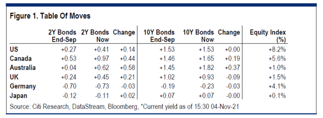 摘要:花旗预测认为未来12个月美国10年期实际利率或将上升至- 0.5%。考虑到股市对实际收益率的波动已变得更加敏感,成长股或将面临重大回调。 在欧美央行退出量化宽松政策之际,全球股市表现却相对平静。但花旗警告称,随着实际利率大幅攀升,以科技股为代表的成长类股票或面临重大回调。 在央行政策方面,加拿大和澳大利亚央行此前已宣布结束量化宽松政策,并发出加息信号;美联储则正式宣布开始缩减每月1200亿美元的购债计划。 伴随着央行政策改变,短期国债利率也剧烈波动:加拿大、澳大利亚、美国和英国两年期政府债券的收益率在过去一个月里大幅上升;利率市场定价则开始反映加息的预期。 但欧美股市似乎暂未受到相关影响