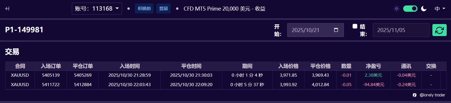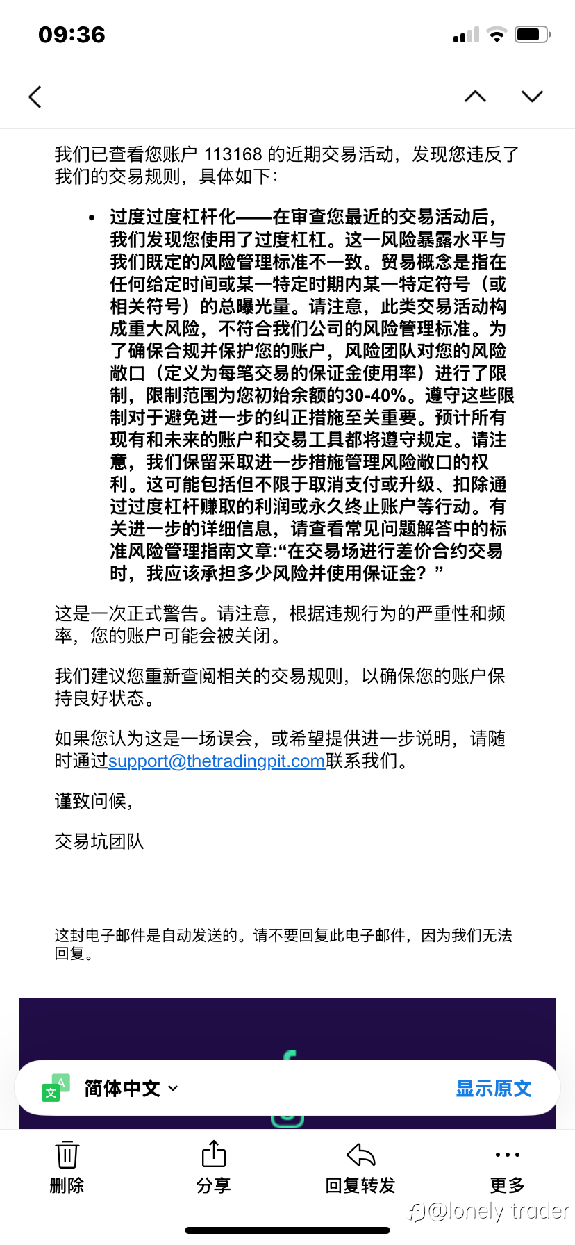 今天写这篇是因为发生了意料之外的事情,昨晚把手里的空单都平了,就酝酿着写一篇文章,主要就是我个人关于平台的担心 先介绍下目前账户的情况,我在10月30日晚通过了2万的账户考核,当晚拿到了新账户,之后交易了几笔,目前盈利1800美金,昨晚平掉了全部持仓 问题的开始出现在拿到新账户当晚,按照之前总结的规则,拿到账户先刷一单,于是我在北京时间10月30日晚21点28分59秒开了第一个0.01的黄金单,持仓1分钟零4秒就平掉了,盈利2.42美金。当晚22点03分正常做了一单黄金0.05手,止损了94.6美金,当天就没有再做 睡觉之前突然看到有一封邮件,如下图 这是一封警告邮件,吓得我一激灵,赶紧打开账