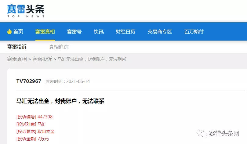 曾被我们无数次报道的“汇圈问题王”马汇Horseforex(网址:https://www.horsegroup.net/zh/,以下统称“马汇”)又被投诉了,近日又一投资者向赛雷真相投诉称,马汇拒绝出金,封其账户,马汇的理由为:用套利机器人,通过报价延迟来获利。该投资者大跌眼镜:“马汇难道就是只能亏,不能赚,赚了就是违规操作?亏了就是正确操作?” 盈利后无法出金 账户被封无法联系上平台 据投资者T先生描述,2019年马汇刚刚从澳汇分出来的时候他就在此平台注册,至2021年5月接近两年的时间不断入金约13000多美金,但账户一直处于亏损状态。 2021年5月19日,因为抓住比特币以及以太坊空头行