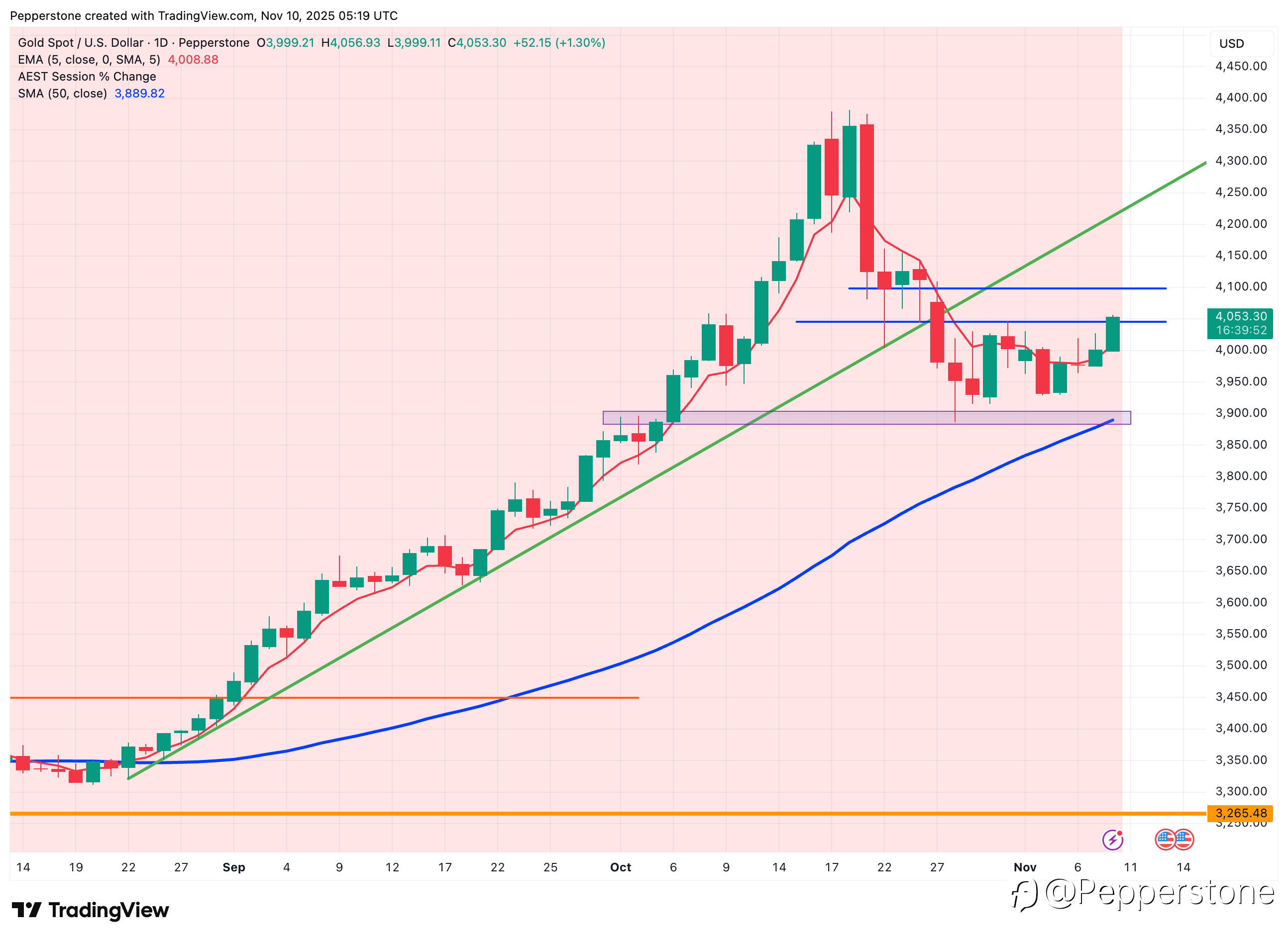 在美联储降息路径摇摆、科技股回调与央行持续购金背景下,金价延续震荡整理格局。本周关注政府重启进展及市场流动性变化,或成为引导黄金趋势性走势的关键。 过去一周,黄金延续区间震荡走势,今日早盘成功重返 $4,000 关口。目前金价的支撑主要来自三方面:一是美国政府停摆持续发酵,增加市场避险需求;二是全球股市科技板块回调,削弱风险偏好;三是各国央行,尤其是中国央行,持续增持黄金,为价格提供稳定支撑。然而,市场对美联储 12 月降息预期的反复摇摆,也在一定程度上限制了金价的进一步上行空间。 随着政府关门曙光初现,本周交易员应密切关注停摆结束的进展,我判断,这可能成为推动黄金重启方向性行情的关键催化剂。