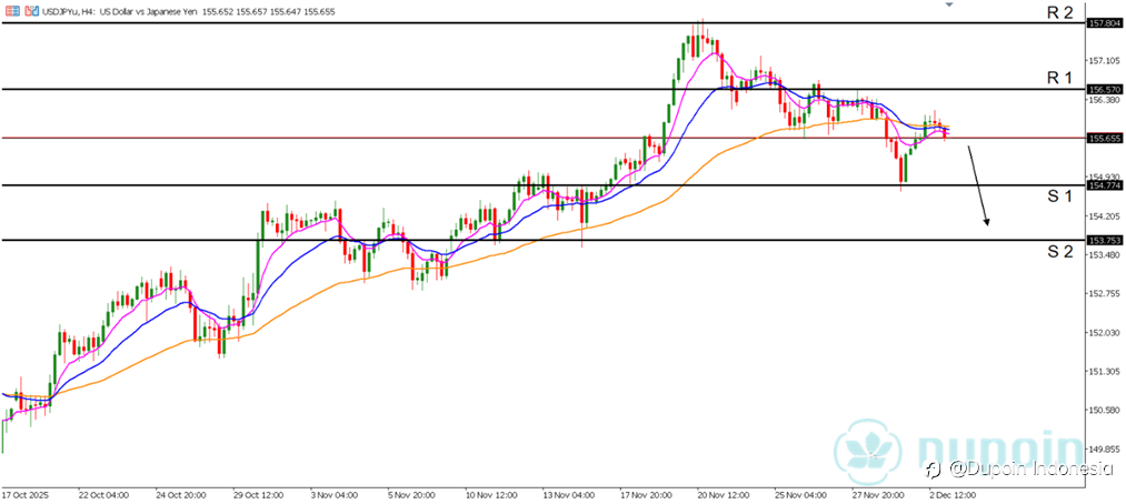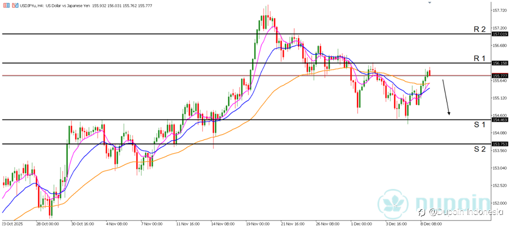Analisa Teknikal Trend : Bearish Timeframe : H4 USD/JPY diperdagangkan di sekitar 155,80 pada hari Senin, naik 0,30% pada hari ini, didukung oleh pemulihan Dolar AS (USD) dan kenaikan imbal hasil obligasi Pemerintah AS. Tekanan beli pada Dolar AS muncul saat pasar melakukan reposisi menjelang keputu