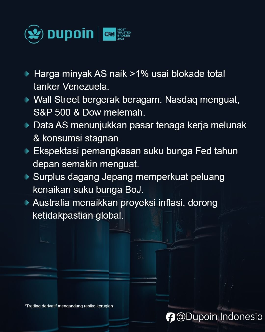 Analisa Teknikal Trend : Bullish Timeframe : H4 Harga minyak naik lebih dari 1% pada hari Senin menyusul serangan pesawat nirawak oleh Ukraina, penutupan wilayah udara Venezuela oleh Amerika Serikat, dan keputusan OPEC untuk tidak mengubah tingkat produksi pada kuartal pertama tahun 2026. Minyak men