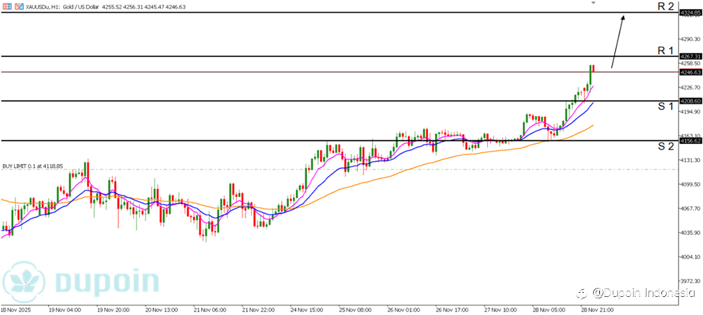 Trend : Bullish | Timeframe 30m Emas Bullish, Berusaha Keluar Zona Konsolidasi Emas berada dalam fase yang nyaris meditatif, bergerak datar di sekitar 4230 tetapi dengan fondasi fundamental yang jauh lebih kukuh dibandingkan beberapa bulan lalu. Arah besar tren emas masih reli yang tidak sekadar imp