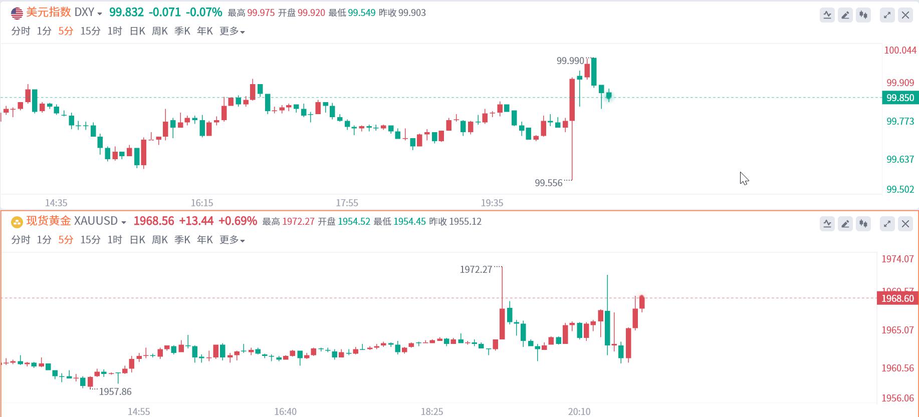 汇通财经APP讯——周二(7月18日),现货黄金价格在美元走软的支撑下上涨,创6月9日以来新高至1972.02美元/盎司。投资者等待即将公布的美国零售销售数据。美国通胀显示降温迹象,且就业市场呈现新平衡,美联储无法一厢情愿地认为7月加息依然不是本轮加息周期的绝唱。 北京时间20:02,现货黄金上涨0.47%至1964.02美元/盎司;COMEX期金主力合约上涨0.58%至1967.8美元/盎司;美元指数下跌0.20%至99.704。 投资者将关注当天晚些时候即将公布的美国6月零售销售数据。市场预计,美联储将在7月25日至26日的政策会议上再次加息25个基点,然后保持该利率水平直至2024年降息