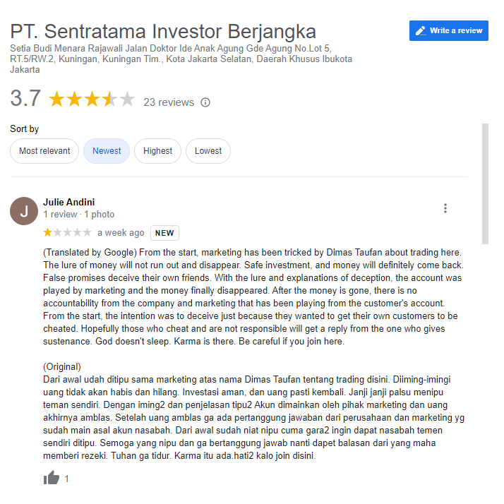 Seorang nasabah broker SIBFX melontarkan kekesalannya lantaran telah ditipu oleh salah satu marketing berinisial D. Diiming-iming akan mendapatkan keuntungan yg besar dan dijamin uang pasti akan kembali, eh malah amblas juga uangnya. Setelah amblas tidak ada pertanggungjawaban baik dari perusahaan a