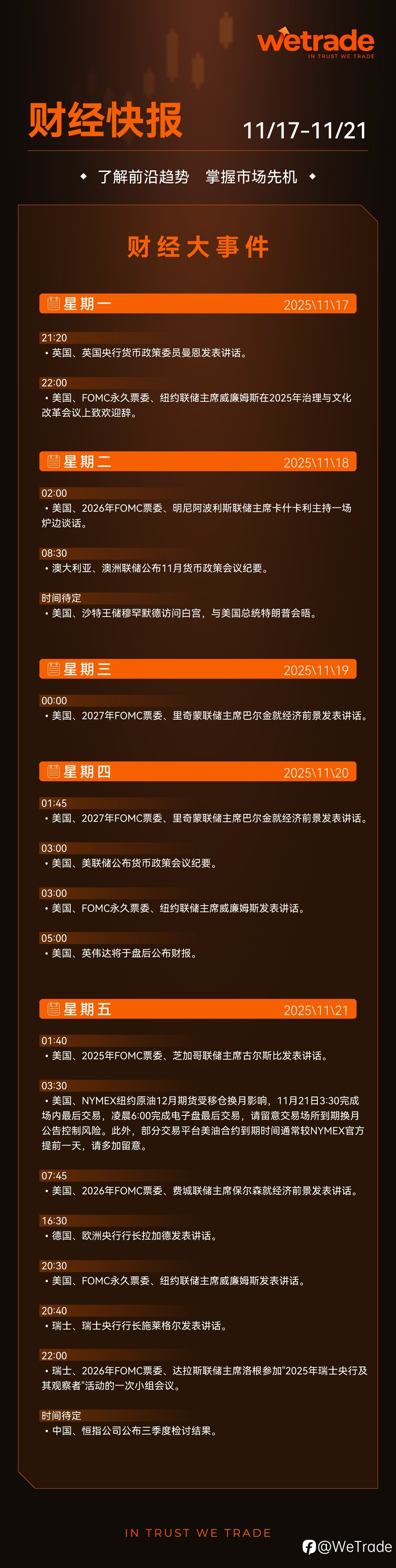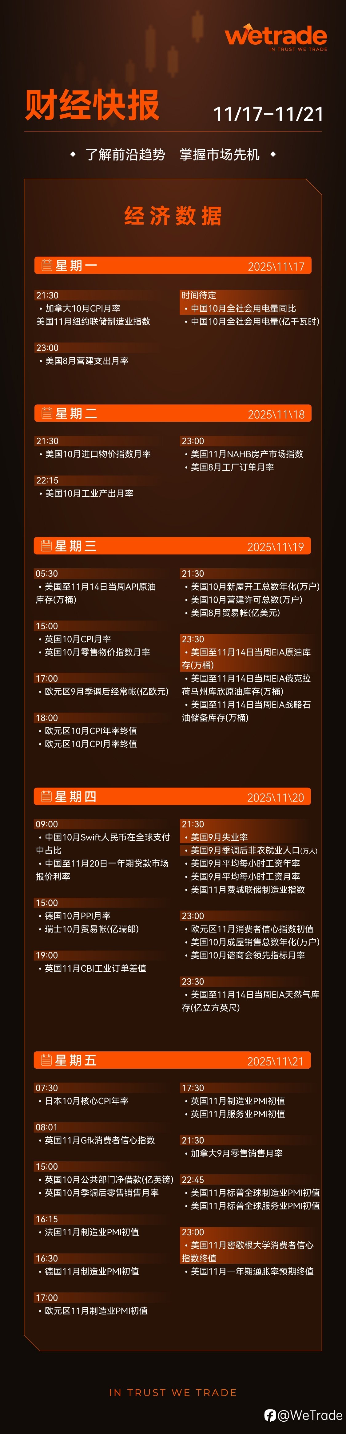 WeTrade财经快报丨十一月第三周国际要闻早知道 财富的每一步,都有WeTrade相伴 本周有哪些重要的经济数据和大事件 记得重点关注哦!