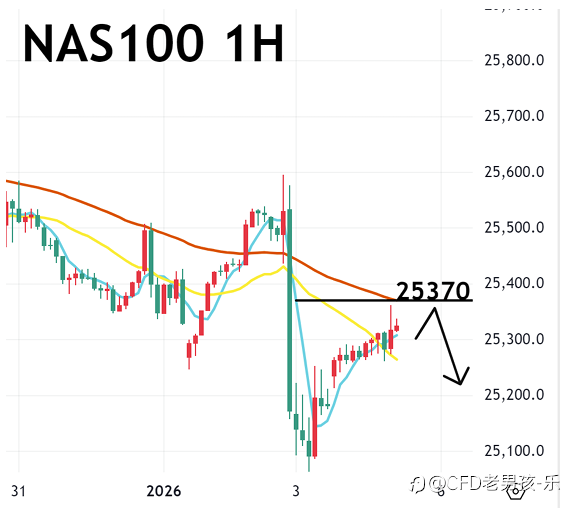 01/05 晚盘策略:黄金/纳指/美油 资金未完全回归 美股走势震荡 美国三大股指涨跌互见 【基本面分析】 周五(2日)美国无重要经济数据公布。2026年第一个交易日,市场仍交投清淡,多数投资者仍在年末假期。市场检视AI巨额投资的成本回收风险告段落,中美关系和缓,美国政府积极推动AI、太空竞赛等发展,不过利率前景不明,加上资金尚未完全回归,美股走势偏向回调震荡,美国三大股指涨跌不一。 油市方面,俄乌战争和委内瑞拉的地缘风险,不敌供应过剩担忧,油价走弱。OPEC+同意第一季暂停增产。显示该组织对原油需求预估悲观,油价上方压力较大,短线应会延续跌势。 【技术分析】 纳指一小时图, MA5金叉MA2