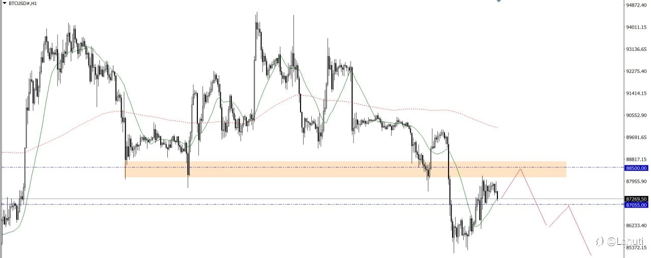 #BTC Cơ bản thì view giảm của tui vãn k có gì thay đổi nha! Giá vẫn giảm và nhịp hồi hôm qua chỉ là nhịp hồi kỹ thuật thôi. Dự kiến giá sẽ giảm luôn từ đây và mất mốc 87.055 thì xem như giá giảm mở rộng (có thể canh retest lại 87.055) để short. Chiều hướng giá tăng thì BTC dễ bị hạn chế ở 88.