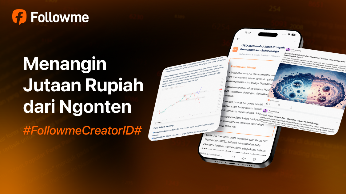 Program Followme Creator ID memberi kamu panggung untuk berbagi ide, pengalaman, dan strategi trading melalui konten keren—artikel atau video. Tujuannya? Membawa komunitas Followme ke level berikutnya dengan insight dari kamu!