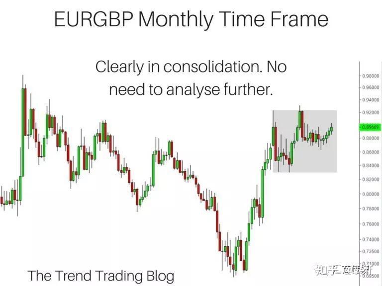 我从每月的时间范围开始分析。在此时间范围内,我将查看价格是处于盘整还是趋势状态。如果价格在每月时间范围内处于盘整状态,我将不对此图表做交易。