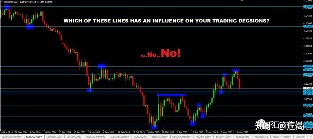有的交易者觉得,画支撑位和阻力位是一件很容易的事。然后并不是这样。有时候能够识别,但是画出支撑位和阻力位还是不够精准。这往往容易让交易者产生错误的交易行为,甚至造成满盘皆输的后果。我想,这可能是因为有两个地方没有做对。直接点说,支撑位和阻力位并非坚固的防守线,价格可能不断来回穿越。这是任何交易市场的本质:价格永远在变化。我发现,很多人在画支撑与阻力位时会出现两个错误。当然可能有其它原因,但这两个错误是比较明显的,所以我在这里稍加说明。1. 做得过度——画交易价位并非是在填补图表的空白不要过度在图表中画出你认为重要的价位。可能你画的这些价位对之后的价格波动没有任何意义。市场的很多变化都是随机的、