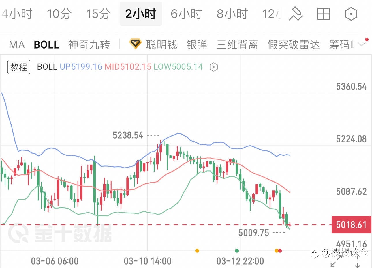 大海:3-16黄金早评 | 决议前磨底,4998成生死线 行情回顾:铁子们,又是新的一周,早上好!早盘现货黄金报5013美元,较昨收5018小幅回落0.1%,今开4999,最低精准下探4998,触及关键支撑后弱反弹,最高摸至5030,国内黄金T D同步走弱至1124元,典型的决议前磨盘杀走势。 宏观面:美联储3月决议倒计时,市场押注维持利率不变概率超99%,6月降息预期彻底降温,“高利率更久”预期推升美债收益率站稳4.25%,美元指数企稳100.4上方,直接压制黄金持有成本;中东避险情绪消退,ETF短期减仓,但全球央行购金仍托底中长期。 技术面;1小时