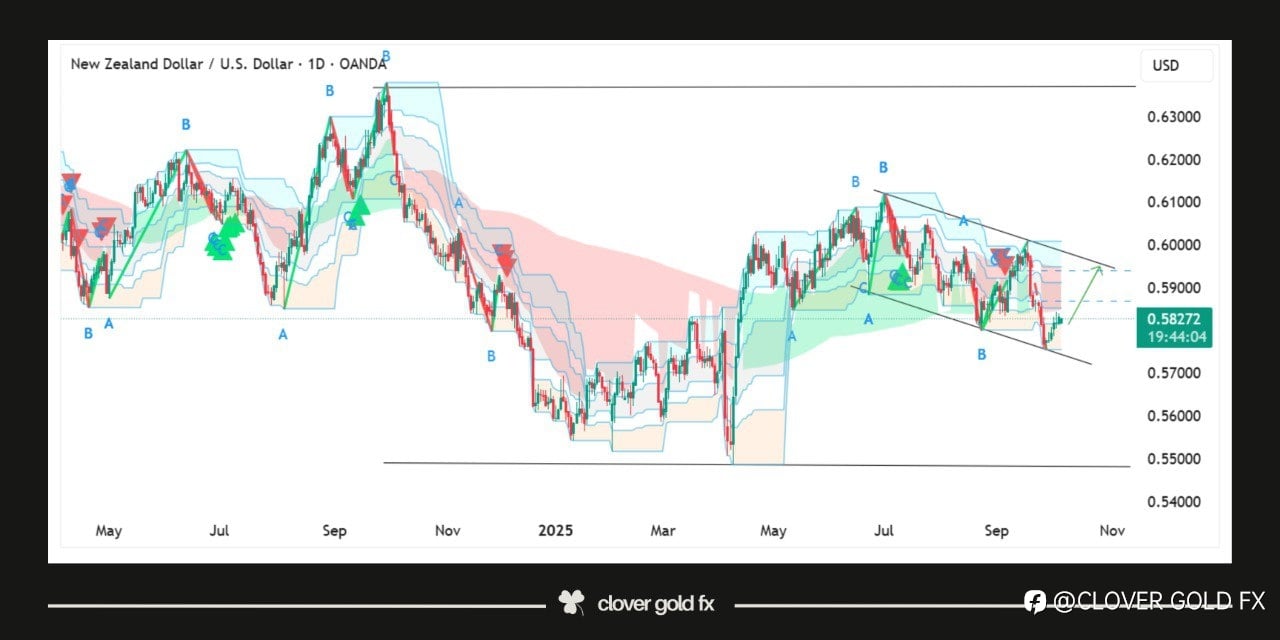 The NZDUSD 12H chart shows a Elliott Wave structure where the market completed a five wave decline followed by an ABC corrective rally and is now forming a bullish flag pattern. The flag is marked by ...