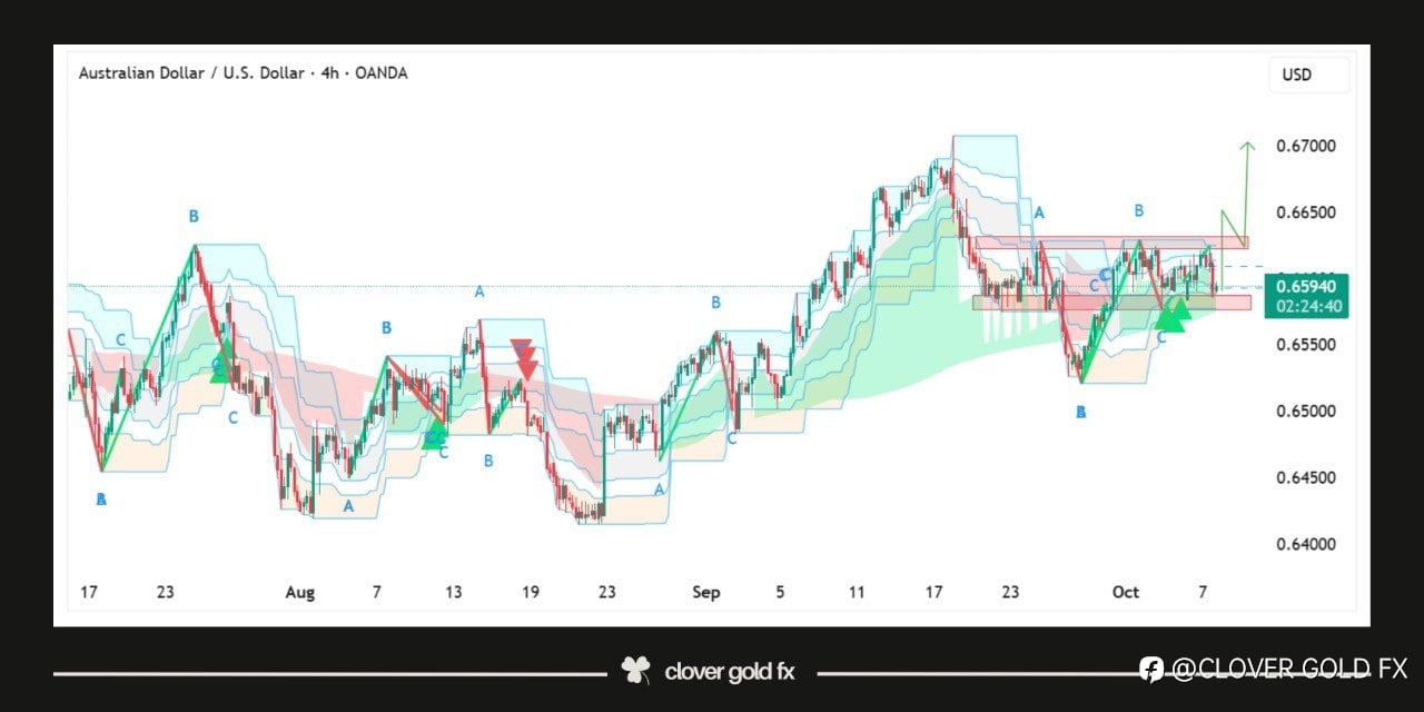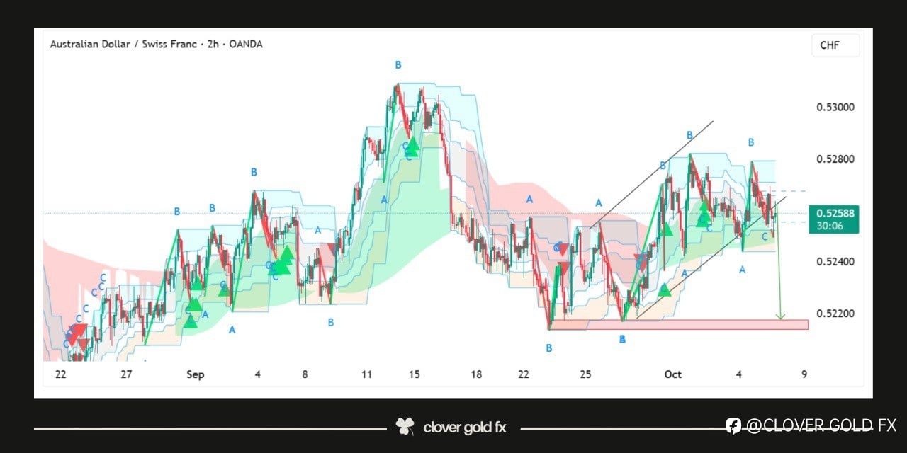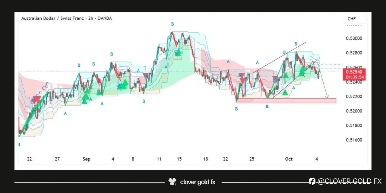 AUDCHF 2H chart Wave structure with a completed five wave bearish move followed by an abc corrective pattern. After the impulse ended the market created a corrective rise where wave a and wave c forme...