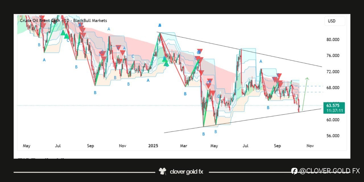 Brent crude oil is showing a contracting pattern on the daily timeframe suggesting the market is moving within a symmetrical triangle where each swing forms a sequence of corrective waves the structur...