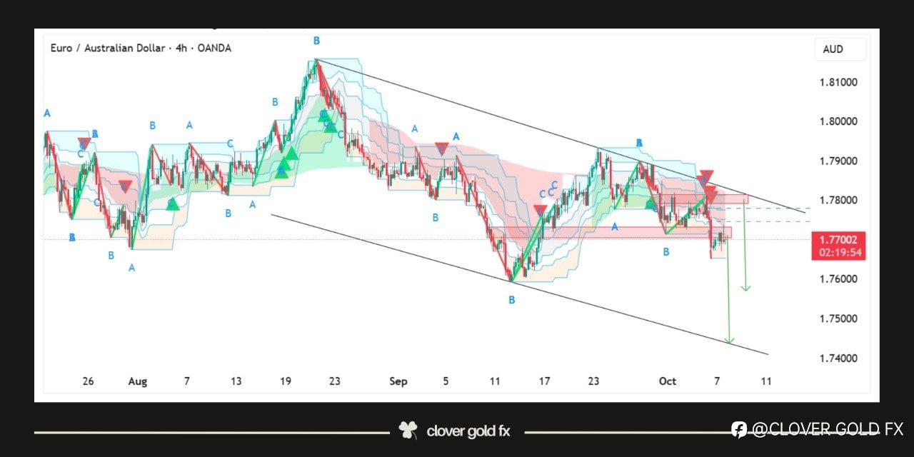 EURAUD 4H chart reveals a clear descending channel pattern, indicating a sustained bearish trend. Price action continues to respect both the upper and lower boundaries of the channel, forming consist...
